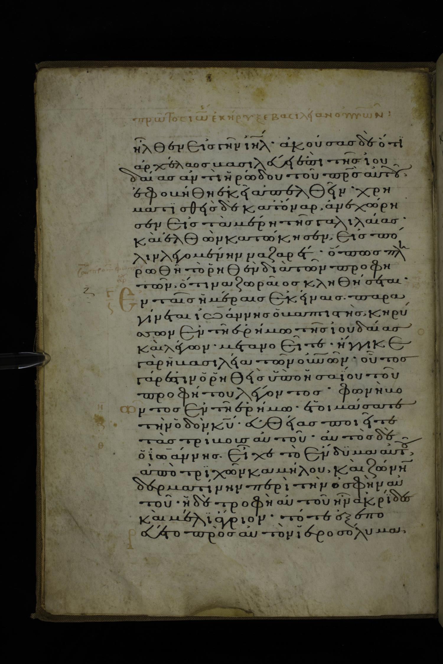 Fourteenth century minuscule of Gospels on parchment; 212 leaves, 1-2 columns, 26-29 lines per column. Images were taken at the National Library of Greece in Athens.