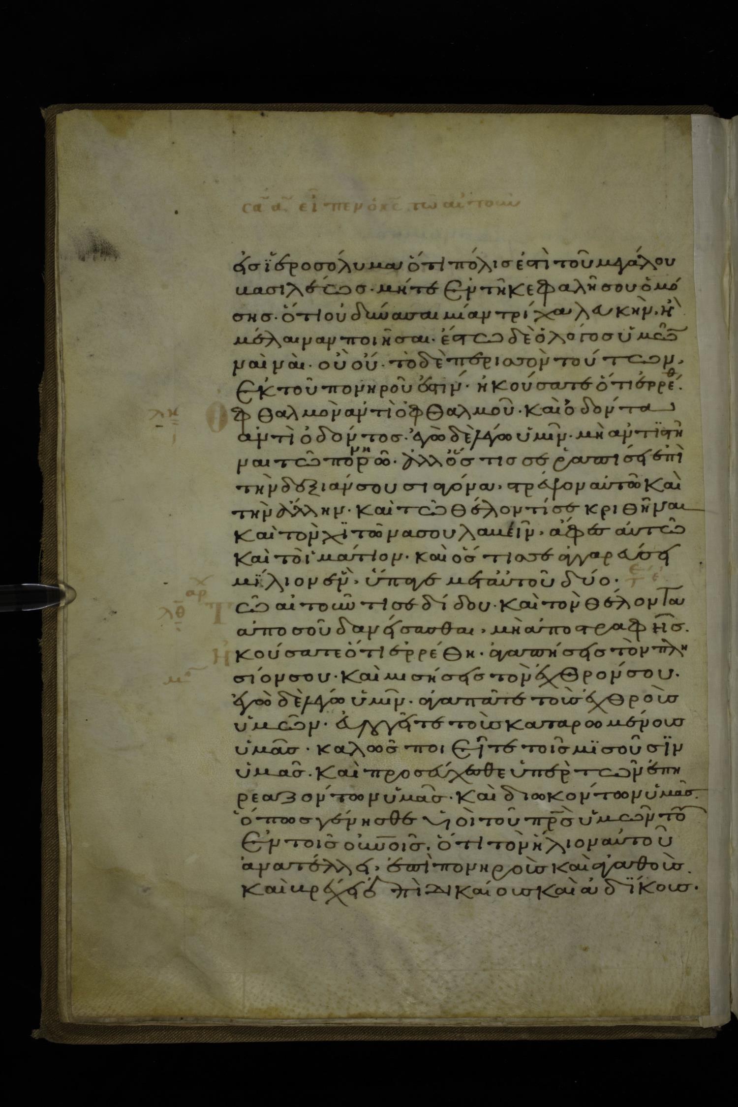 Fourteenth century minuscule of Gospels on parchment; 212 leaves, 1-2 columns, 26-29 lines per column. Images were taken at the National Library of Greece in Athens.