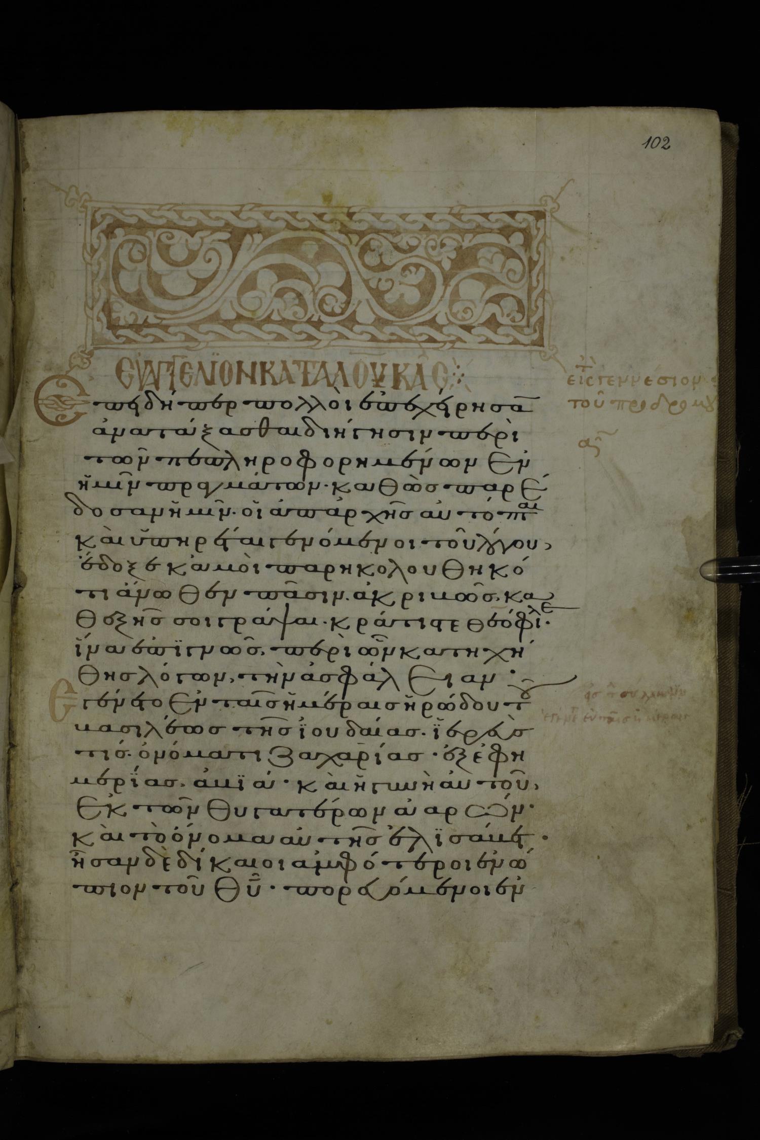 Fourteenth century minuscule of Gospels on parchment; 212 leaves, 1-2 columns, 26-29 lines per column. Images were taken at the National Library of Greece in Athens.