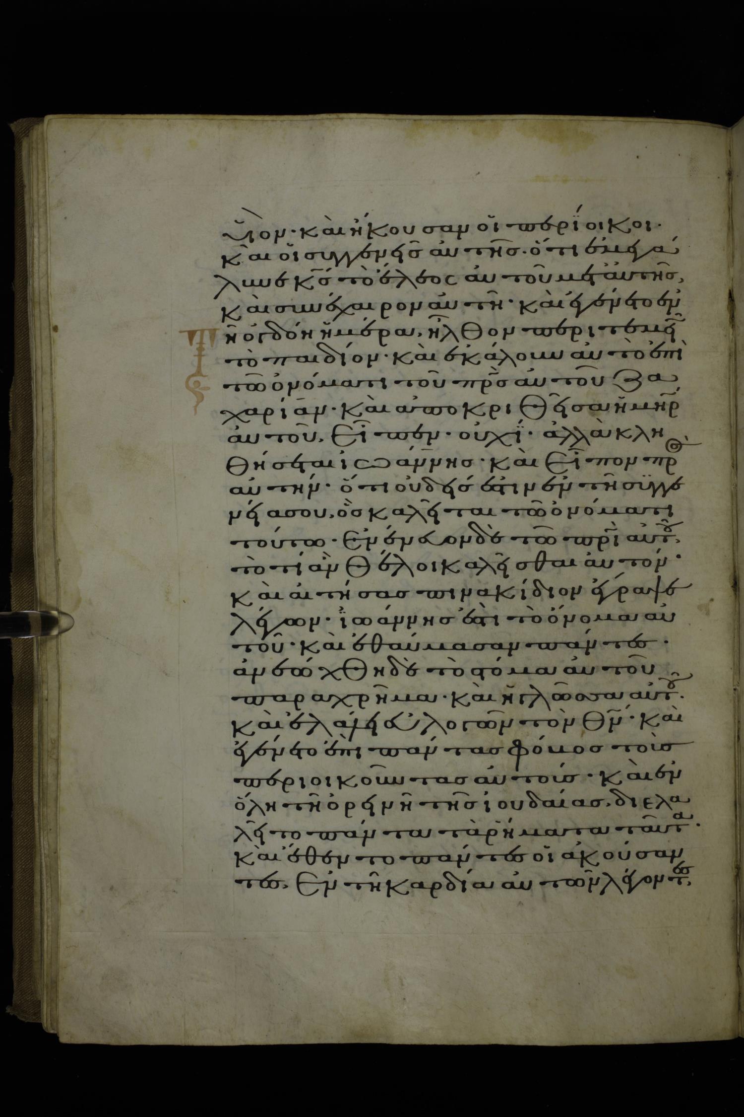 Fourteenth century minuscule of Gospels on parchment; 212 leaves, 1-2 columns, 26-29 lines per column. Images were taken at the National Library of Greece in Athens.