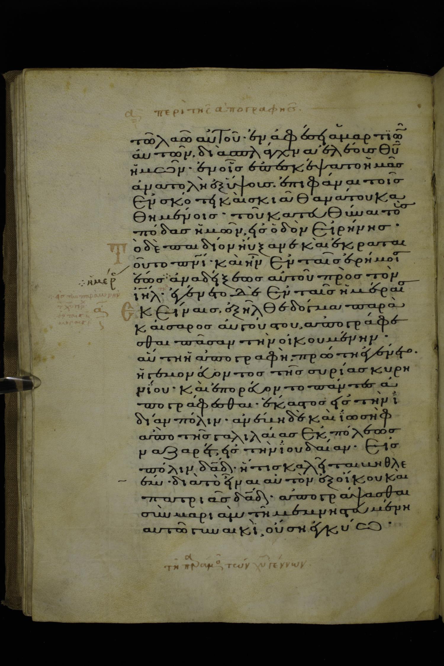Fourteenth century minuscule of Gospels on parchment; 212 leaves, 1-2 columns, 26-29 lines per column. Images were taken at the National Library of Greece in Athens.