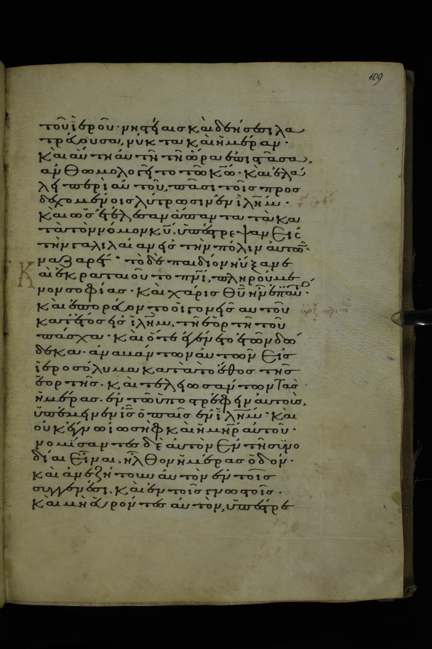 Fourteenth century minuscule of Gospels on parchment; 212 leaves, 1-2 columns, 26-29 lines per column. Images were taken at the National Library of Greece in Athens.