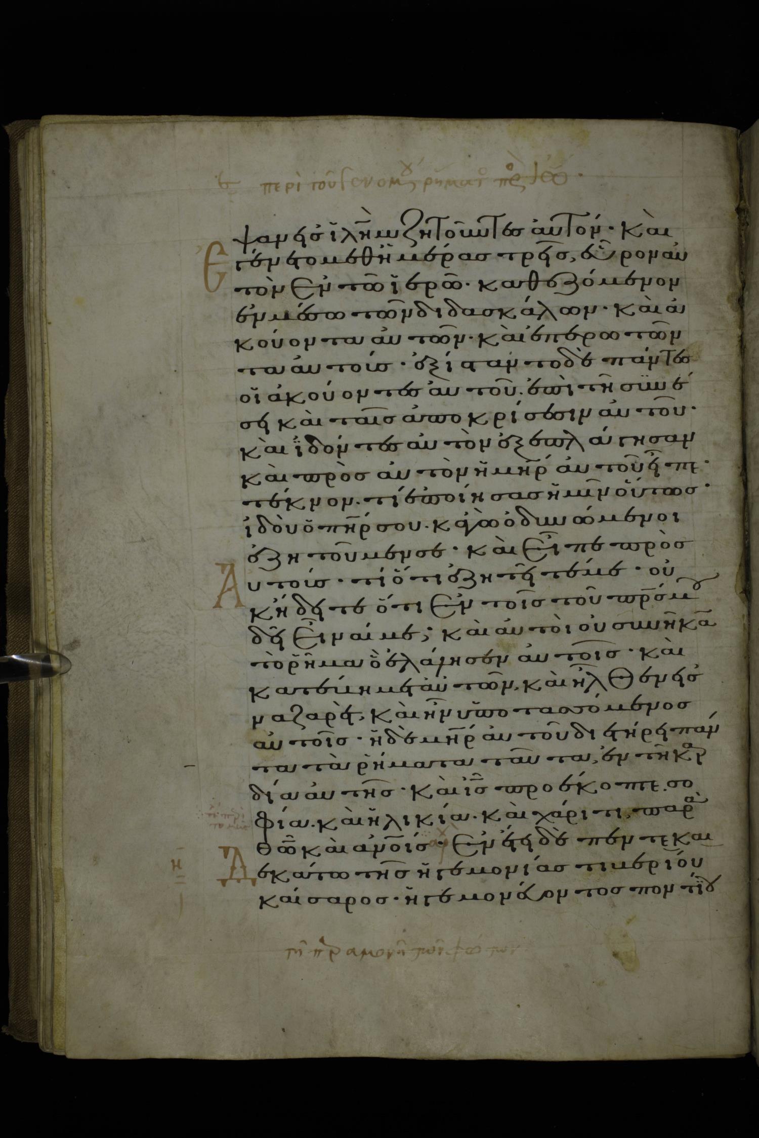Fourteenth century minuscule of Gospels on parchment; 212 leaves, 1-2 columns, 26-29 lines per column. Images were taken at the National Library of Greece in Athens.
