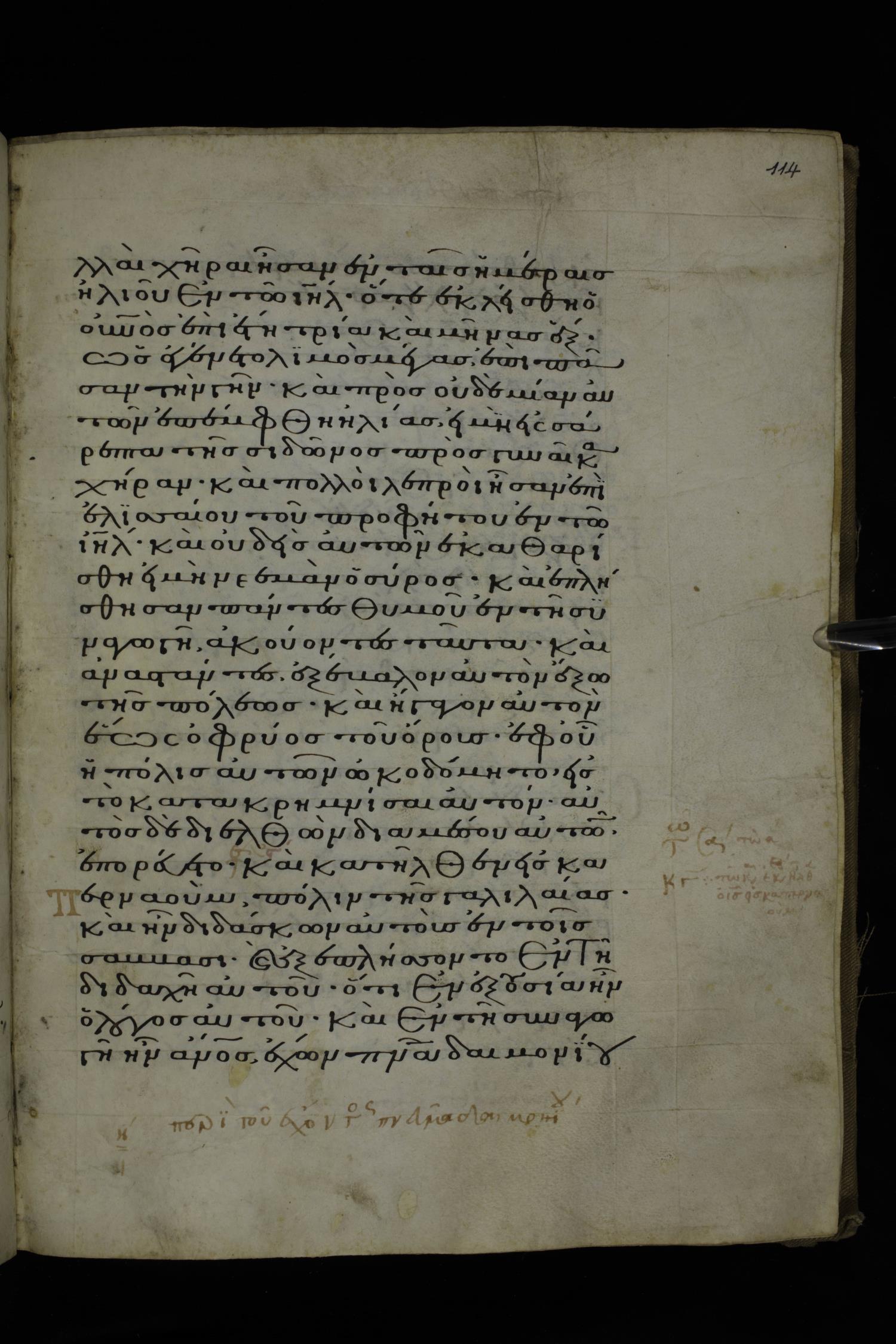 Fourteenth century minuscule of Gospels on parchment; 212 leaves, 1-2 columns, 26-29 lines per column. Images were taken at the National Library of Greece in Athens.