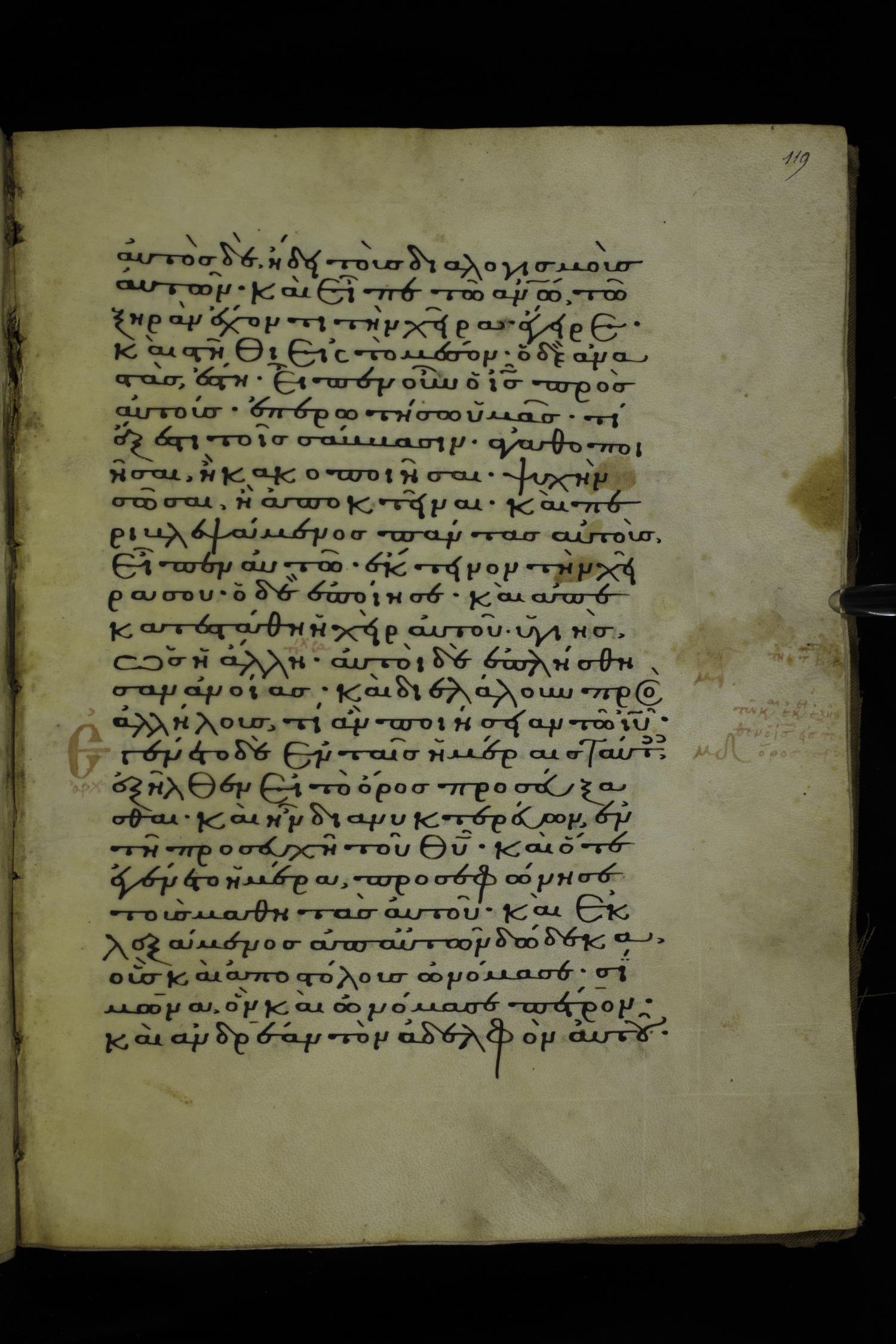Fourteenth century minuscule of Gospels on parchment; 212 leaves, 1-2 columns, 26-29 lines per column. Images were taken at the National Library of Greece in Athens.