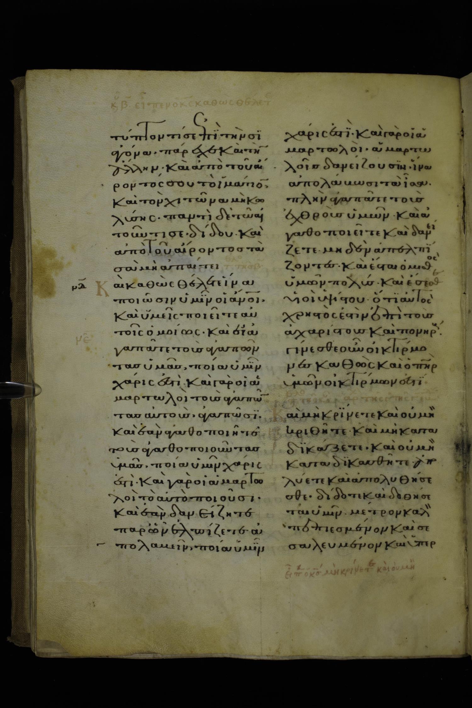 Fourteenth century minuscule of Gospels on parchment; 212 leaves, 1-2 columns, 26-29 lines per column. Images were taken at the National Library of Greece in Athens.
