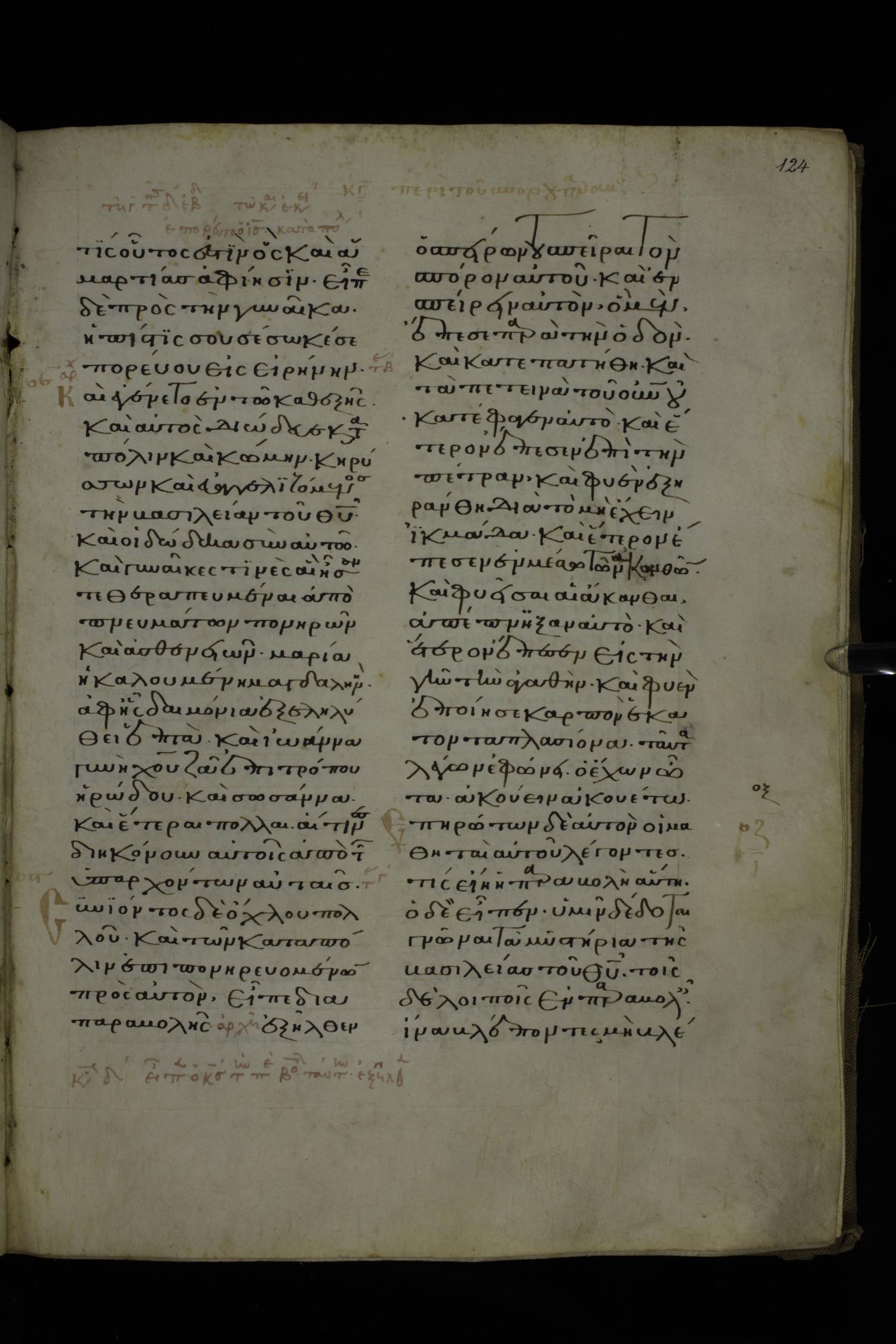 Fourteenth century minuscule of Gospels on parchment; 212 leaves, 1-2 columns, 26-29 lines per column. Images were taken at the National Library of Greece in Athens.