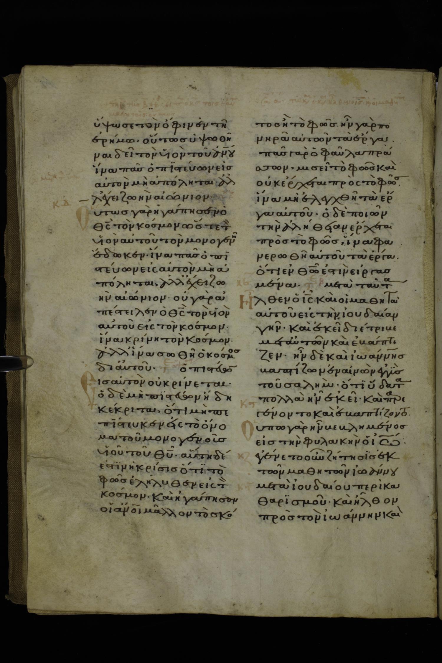 Fourteenth century minuscule of Gospels on parchment; 212 leaves, 1-2 columns, 26-29 lines per column. Images were taken at the National Library of Greece in Athens.