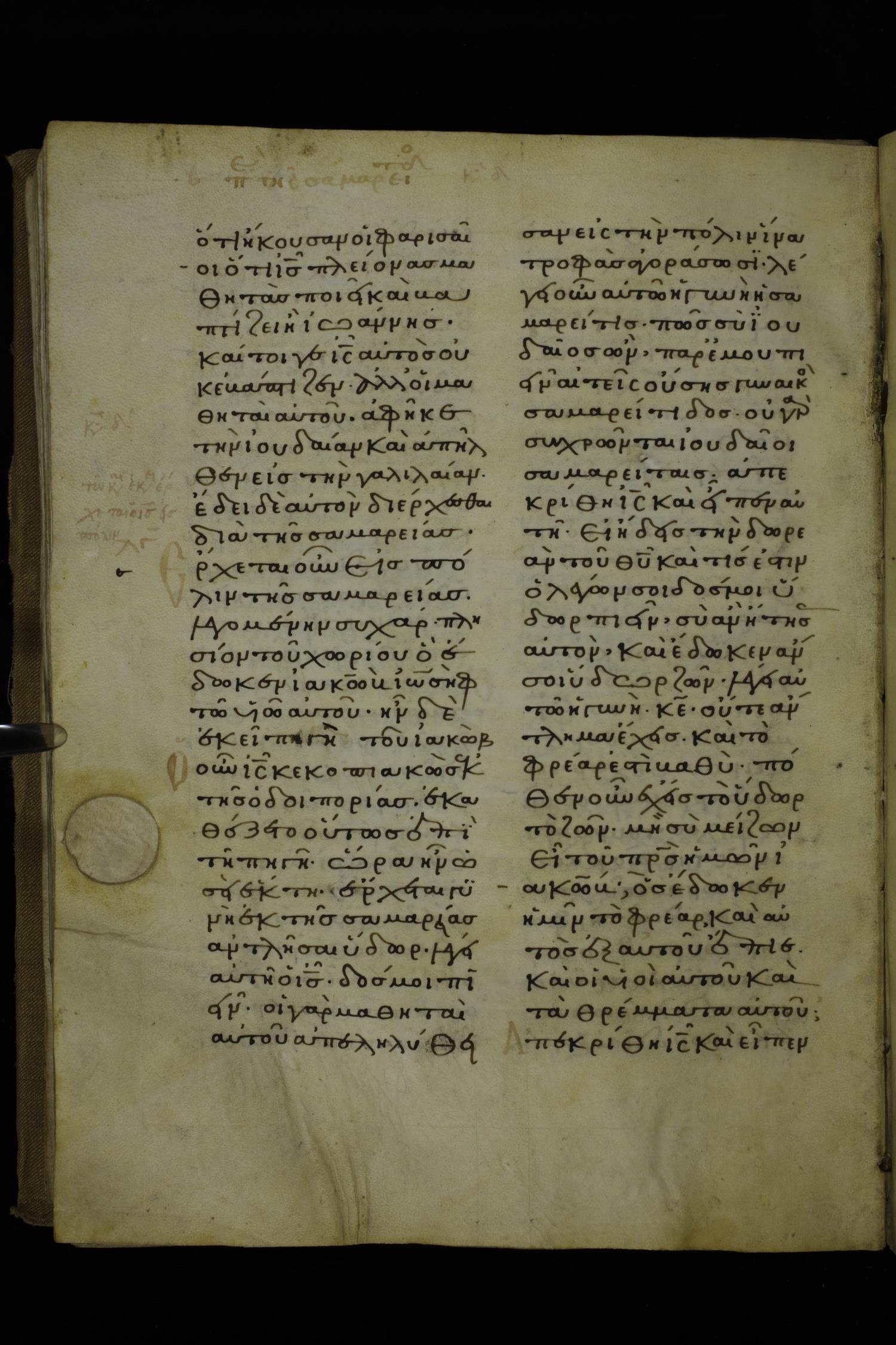 Fourteenth century minuscule of Gospels on parchment; 212 leaves, 1-2 columns, 26-29 lines per column. Images were taken at the National Library of Greece in Athens.