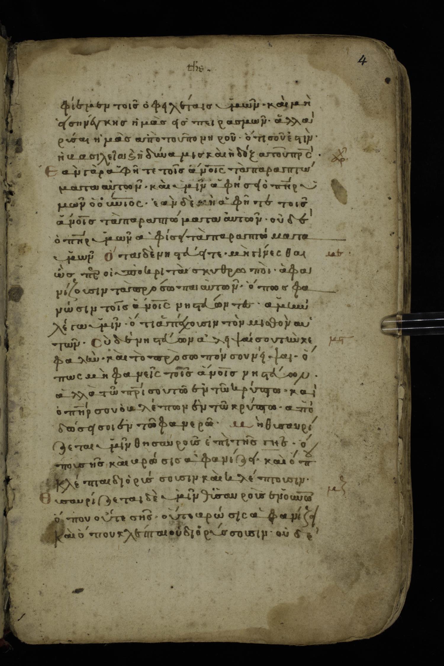 Fourteenth century minuscule of the Gospels on paper; 161 leaves, 1 column, 25-30 lines per column. Images were taken at the National Library of Greece in Athens.