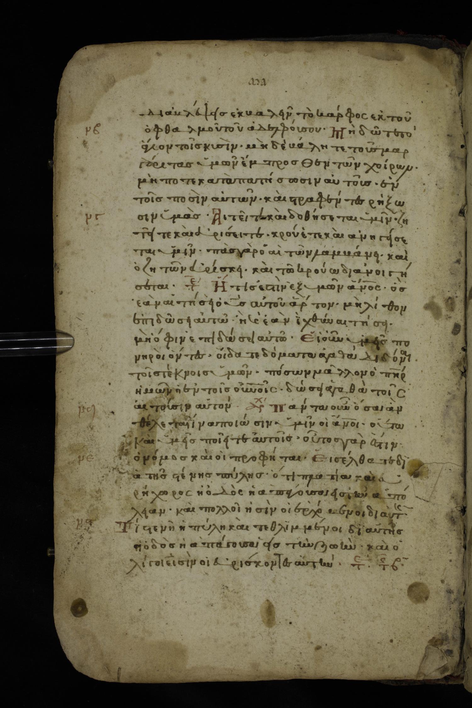 Fourteenth century minuscule of the Gospels on paper; 161 leaves, 1 column, 25-30 lines per column. Images were taken at the National Library of Greece in Athens.