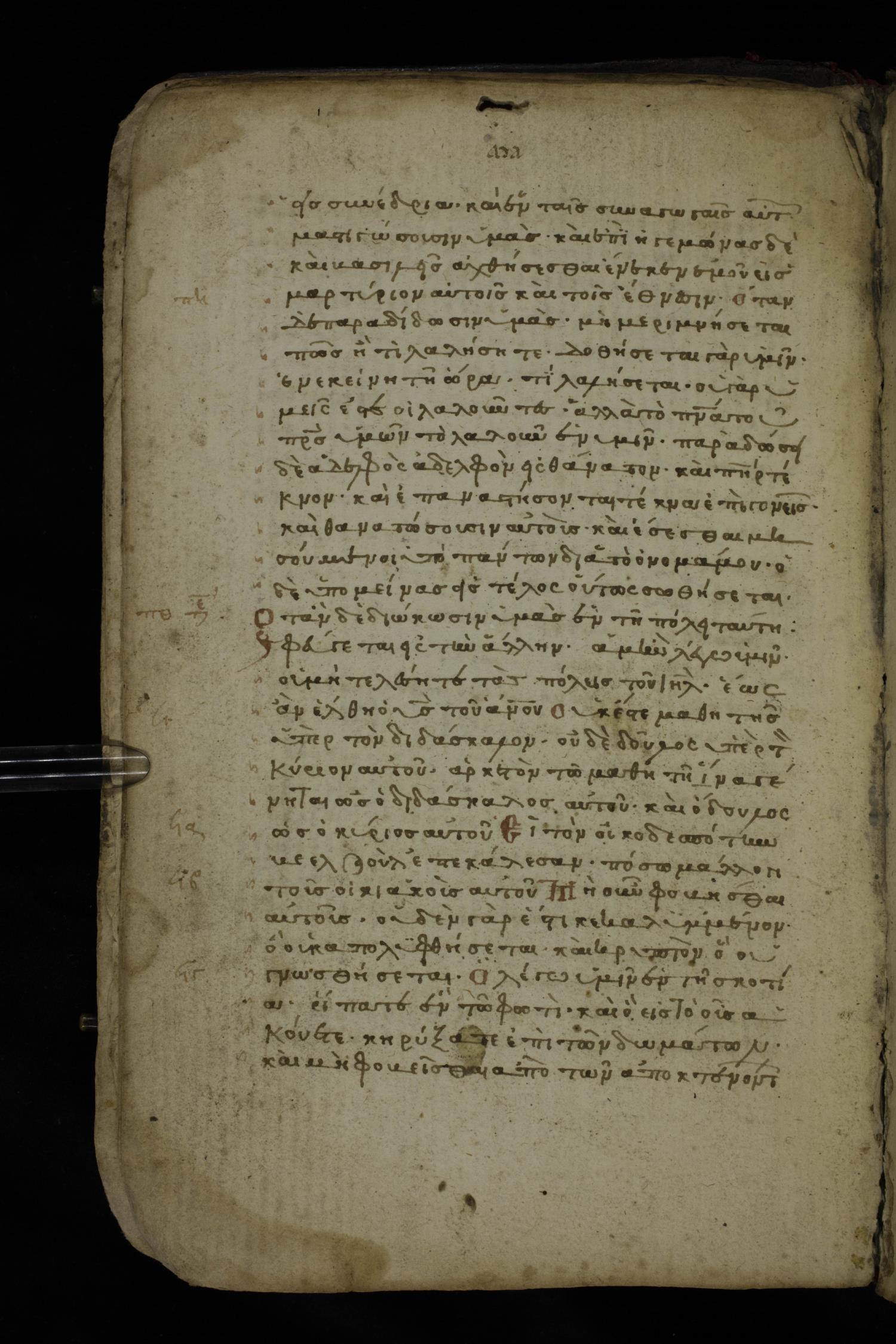 Fourteenth century minuscule of the Gospels on paper; 161 leaves, 1 column, 25-30 lines per column. Images were taken at the National Library of Greece in Athens.
