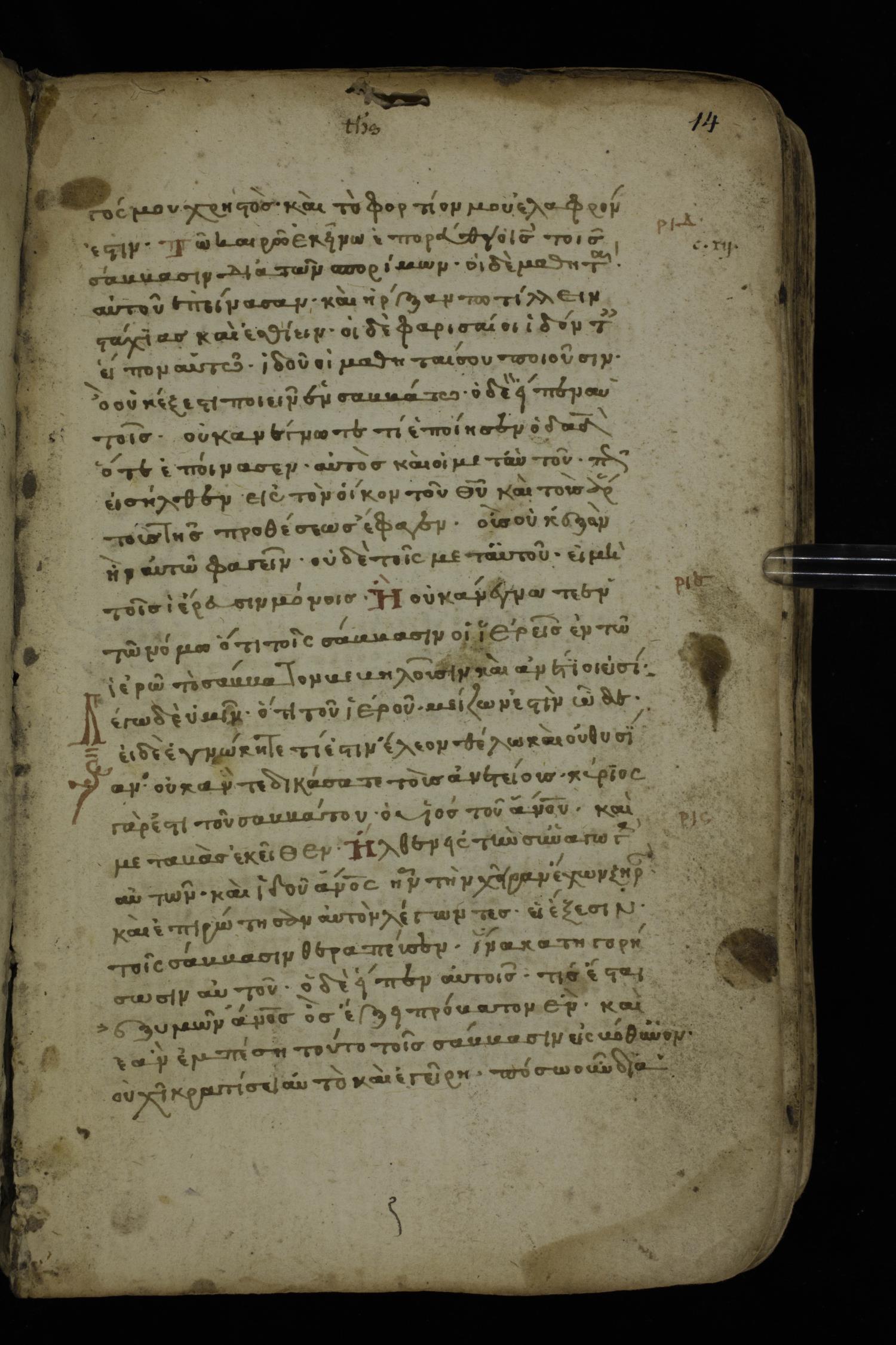 Fourteenth century minuscule of the Gospels on paper; 161 leaves, 1 column, 25-30 lines per column. Images were taken at the National Library of Greece in Athens.
