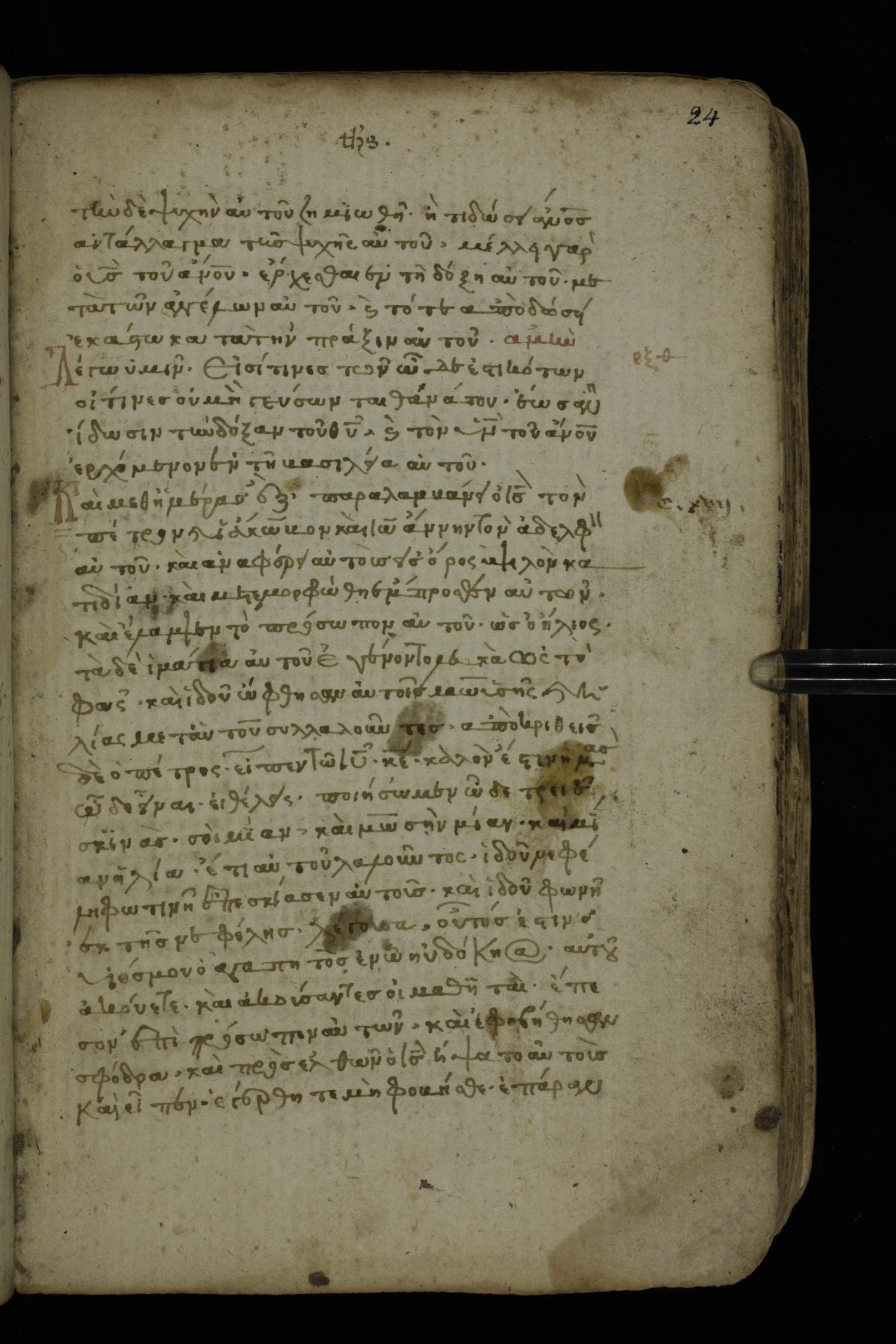 Fourteenth century minuscule of the Gospels on paper; 161 leaves, 1 column, 25-30 lines per column. Images were taken at the National Library of Greece in Athens.