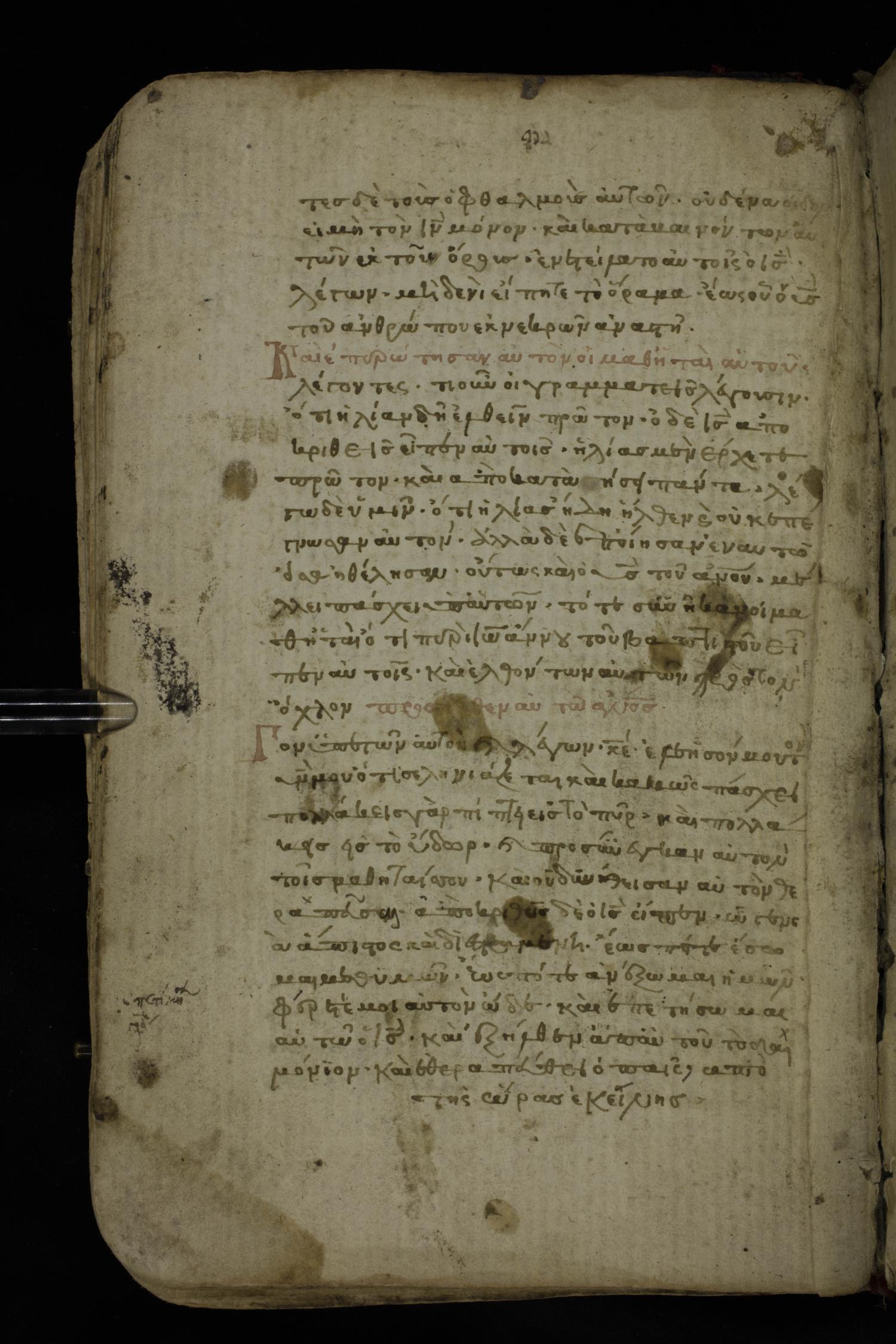 Fourteenth century minuscule of the Gospels on paper; 161 leaves, 1 column, 25-30 lines per column. Images were taken at the National Library of Greece in Athens.