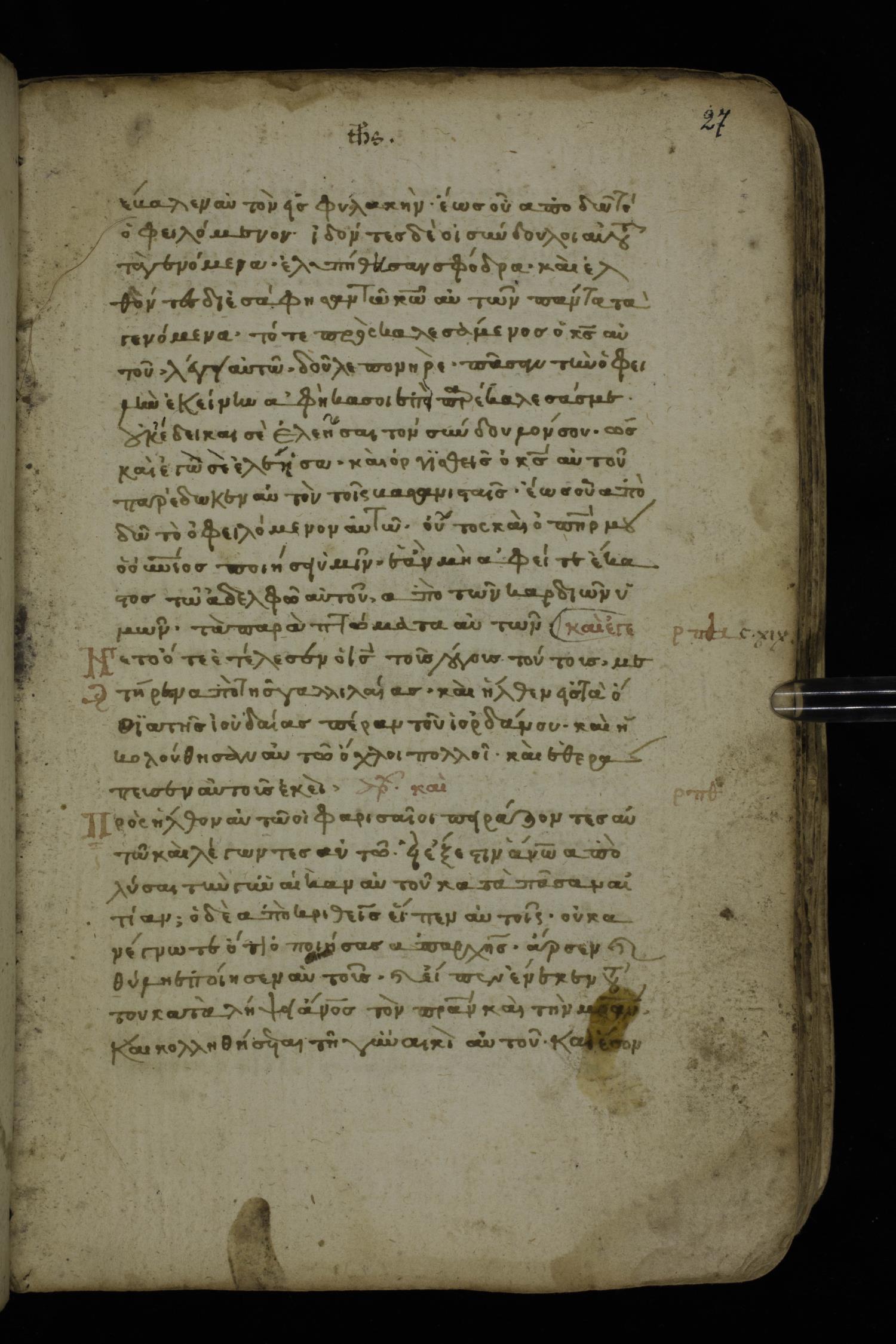 Fourteenth century minuscule of the Gospels on paper; 161 leaves, 1 column, 25-30 lines per column. Images were taken at the National Library of Greece in Athens.