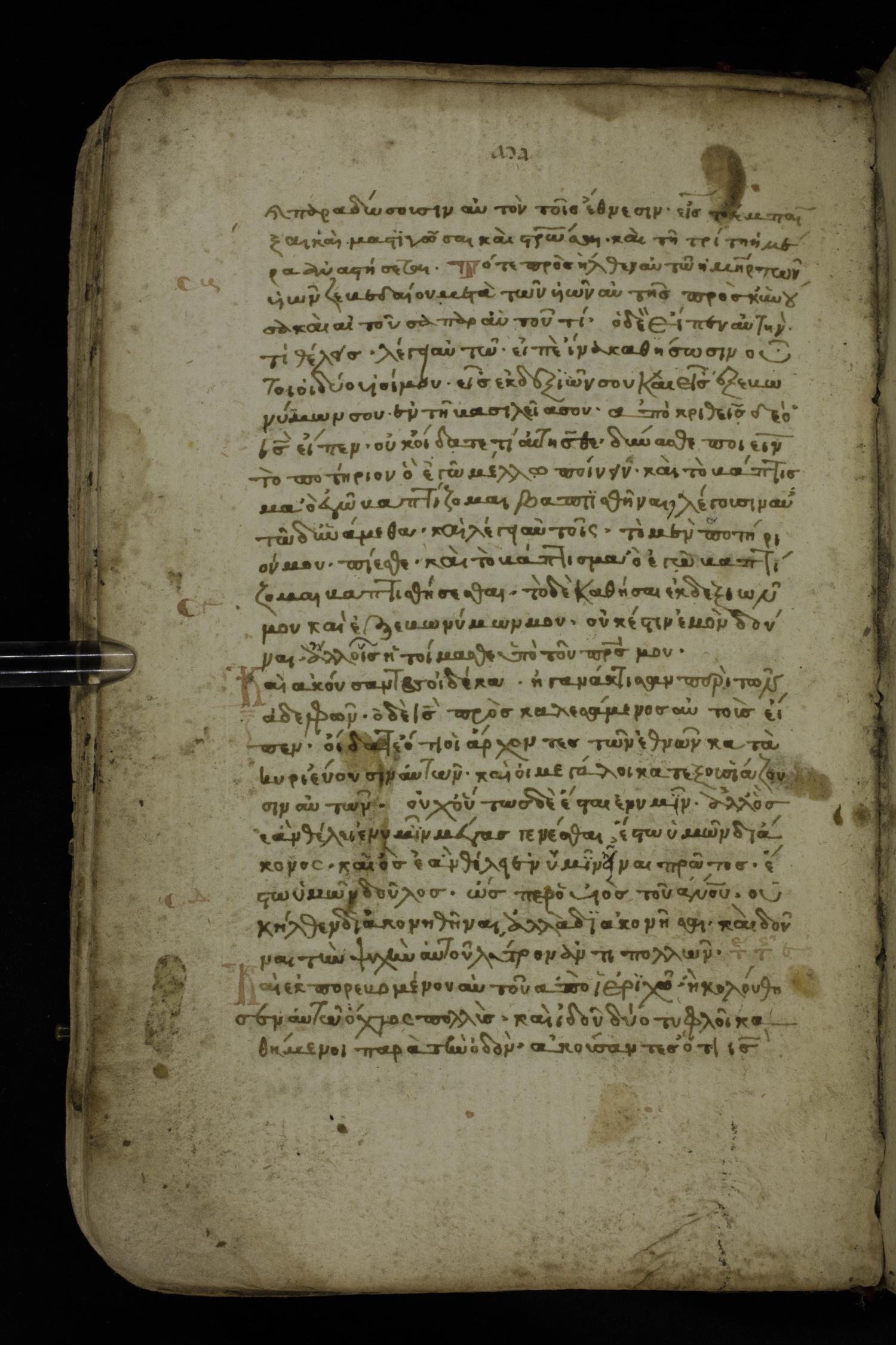 Fourteenth century minuscule of the Gospels on paper; 161 leaves, 1 column, 25-30 lines per column. Images were taken at the National Library of Greece in Athens.