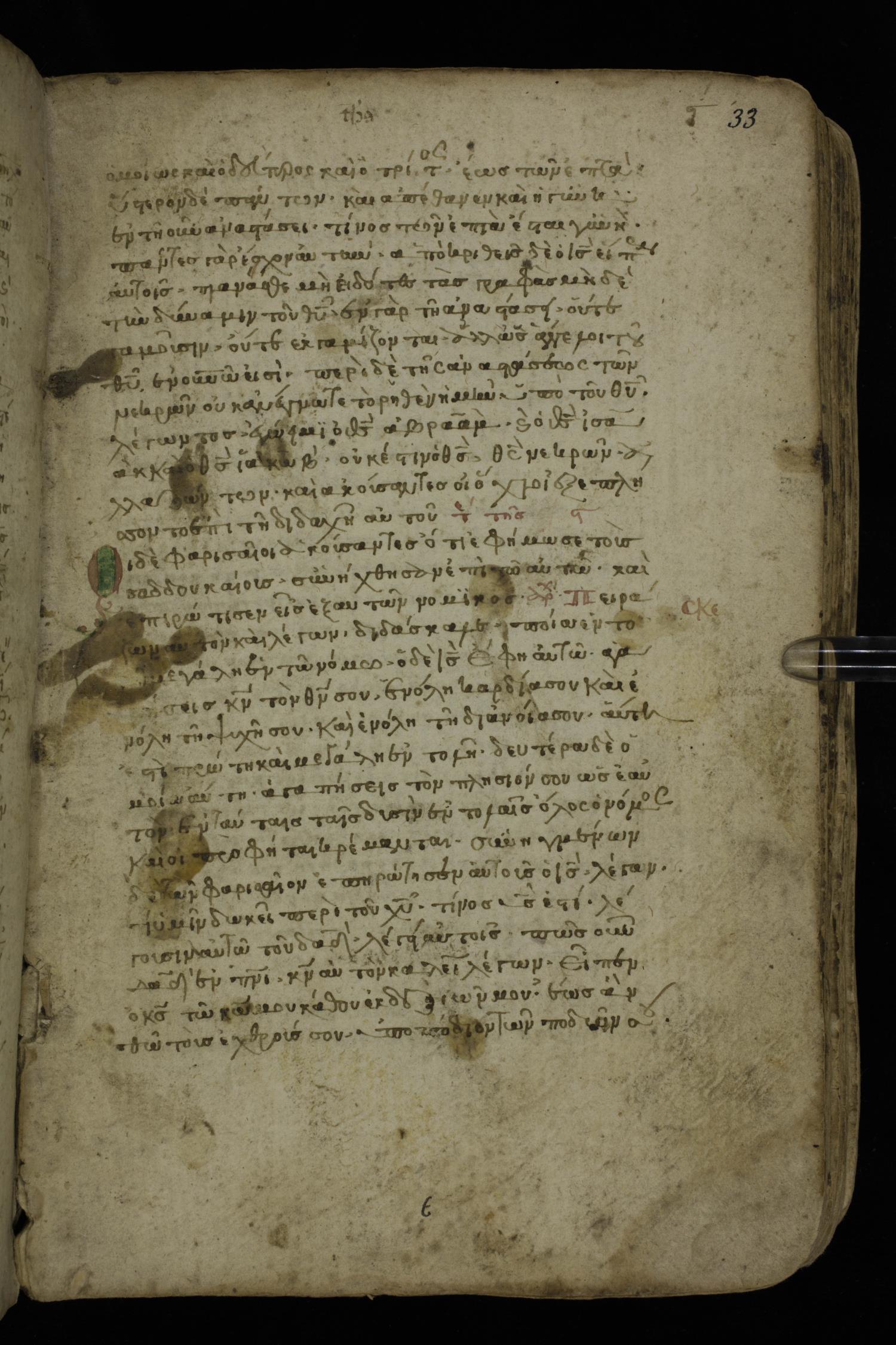 Fourteenth century minuscule of the Gospels on paper; 161 leaves, 1 column, 25-30 lines per column. Images were taken at the National Library of Greece in Athens.