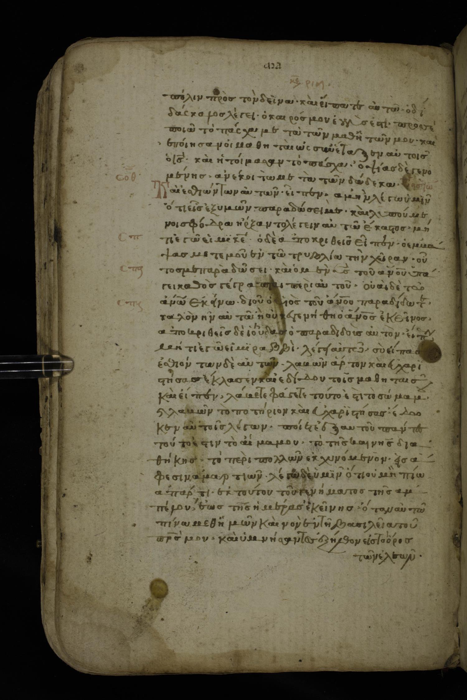 Fourteenth century minuscule of the Gospels on paper; 161 leaves, 1 column, 25-30 lines per column. Images were taken at the National Library of Greece in Athens.