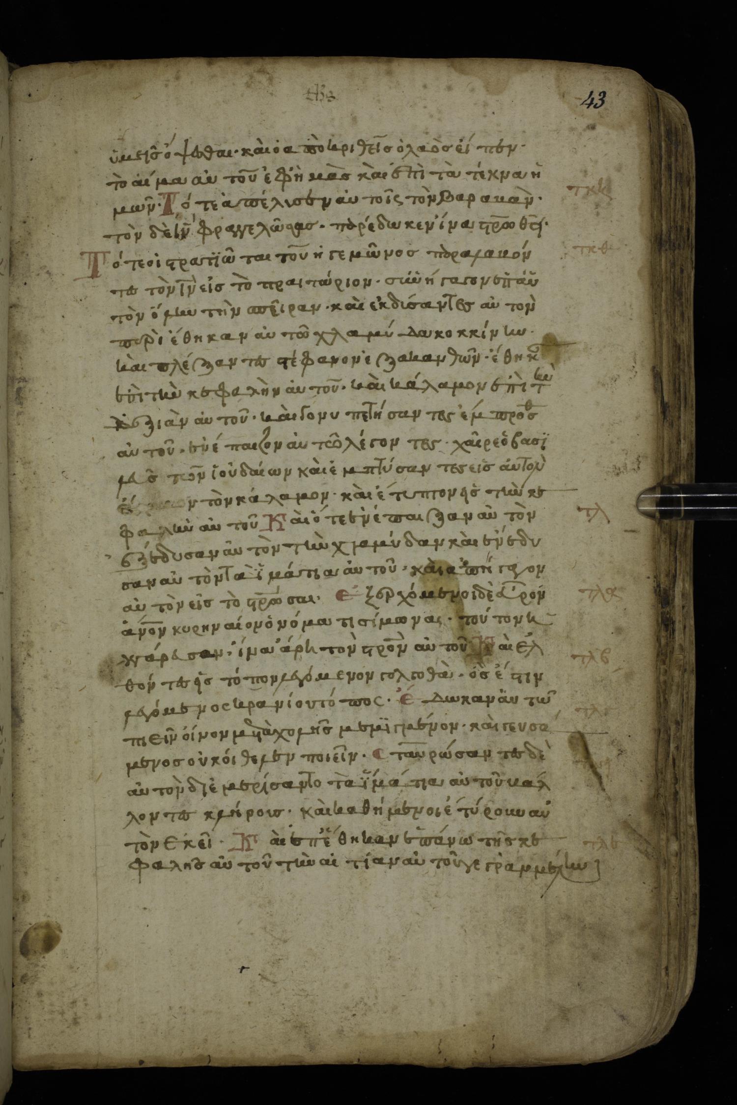 Fourteenth century minuscule of the Gospels on paper; 161 leaves, 1 column, 25-30 lines per column. Images were taken at the National Library of Greece in Athens.