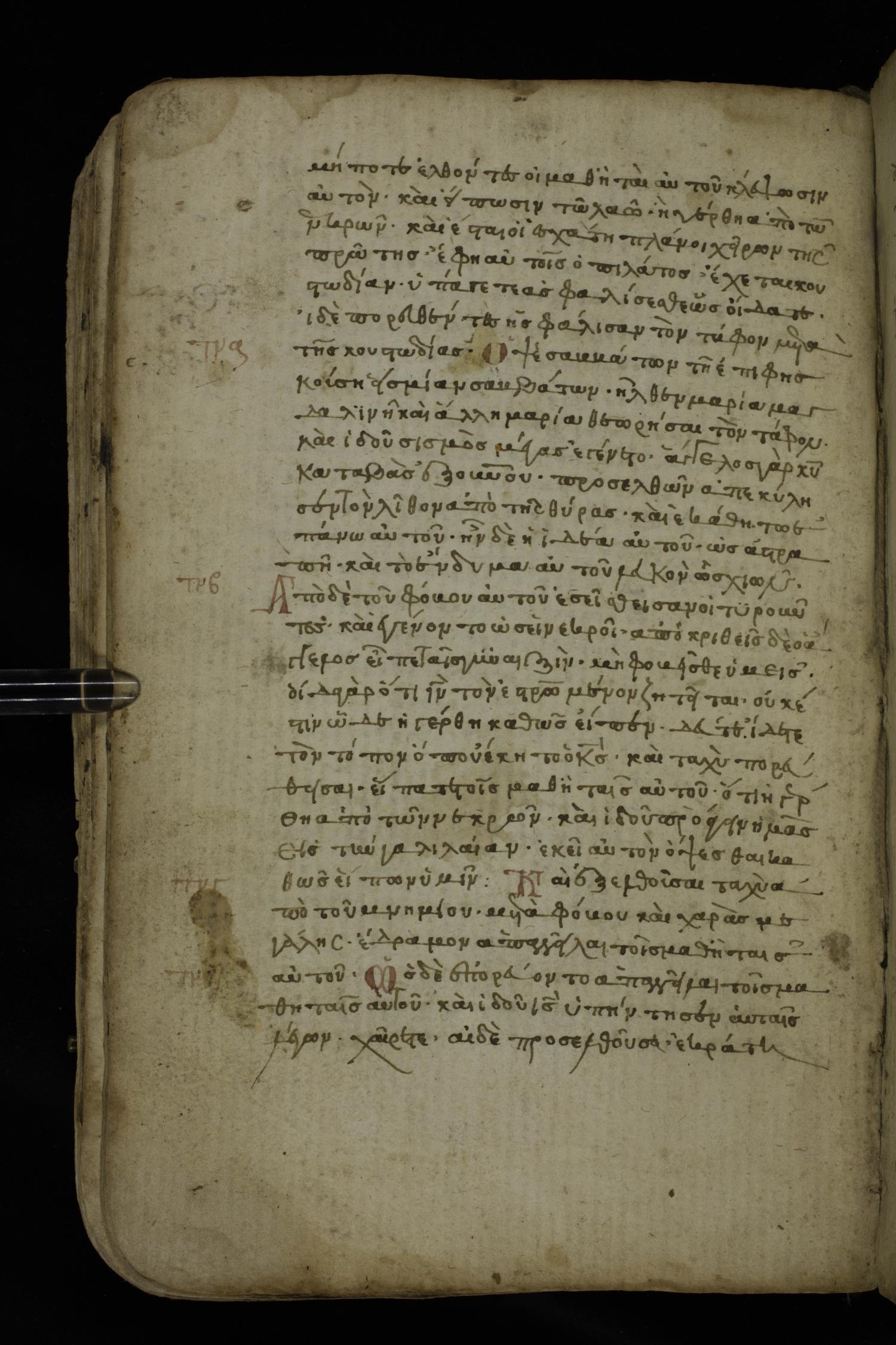 Fourteenth century minuscule of the Gospels on paper; 161 leaves, 1 column, 25-30 lines per column. Images were taken at the National Library of Greece in Athens.
