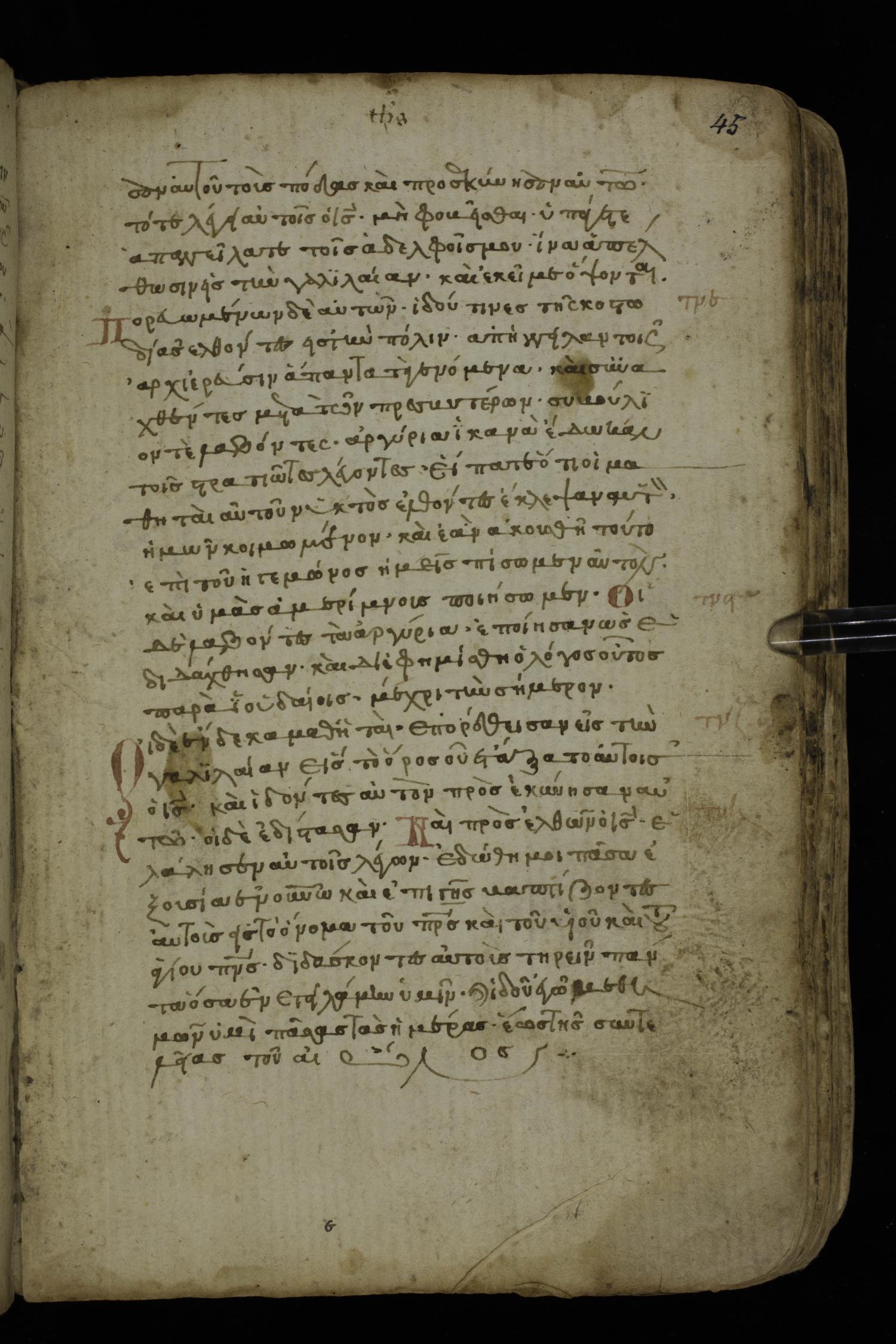 Fourteenth century minuscule of the Gospels on paper; 161 leaves, 1 column, 25-30 lines per column. Images were taken at the National Library of Greece in Athens.
