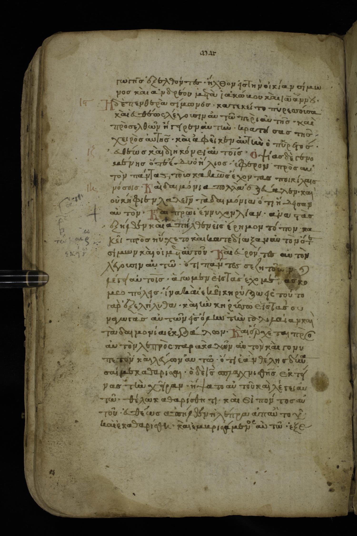 Fourteenth century minuscule of the Gospels on paper; 161 leaves, 1 column, 25-30 lines per column. Images were taken at the National Library of Greece in Athens.