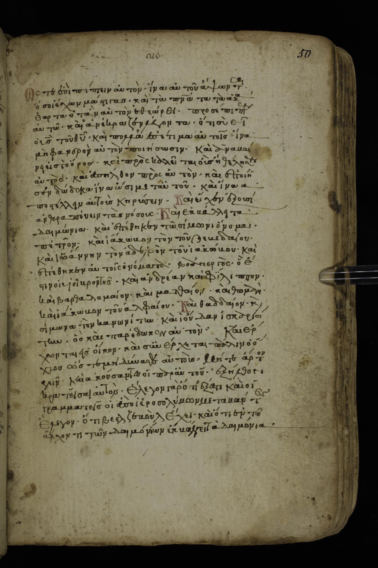 Fourteenth century minuscule of the Gospels on paper; 161 leaves, 1 column, 25-30 lines per column. Images were taken at the National Library of Greece in Athens.