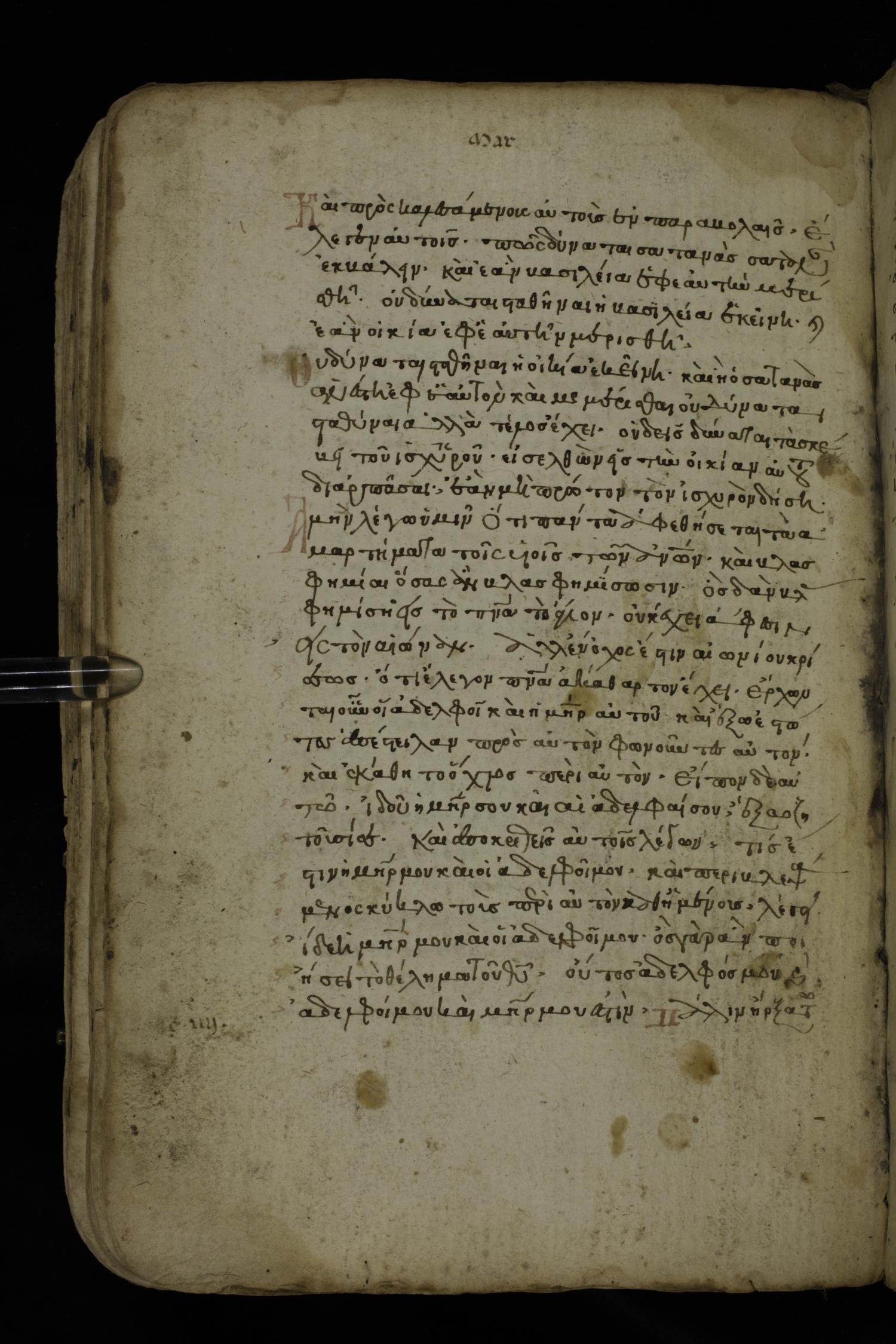 Fourteenth century minuscule of the Gospels on paper; 161 leaves, 1 column, 25-30 lines per column. Images were taken at the National Library of Greece in Athens.