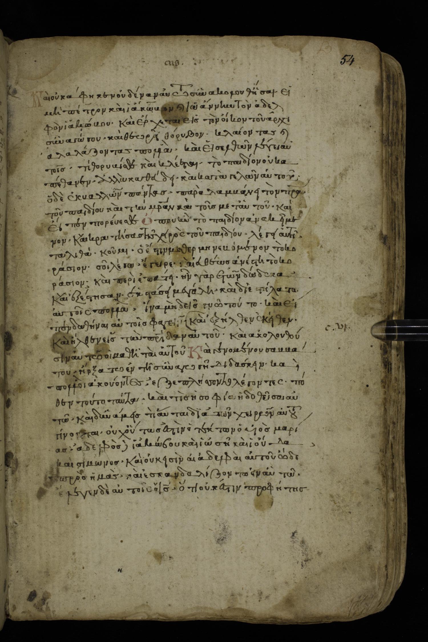 Fourteenth century minuscule of the Gospels on paper; 161 leaves, 1 column, 25-30 lines per column. Images were taken at the National Library of Greece in Athens.