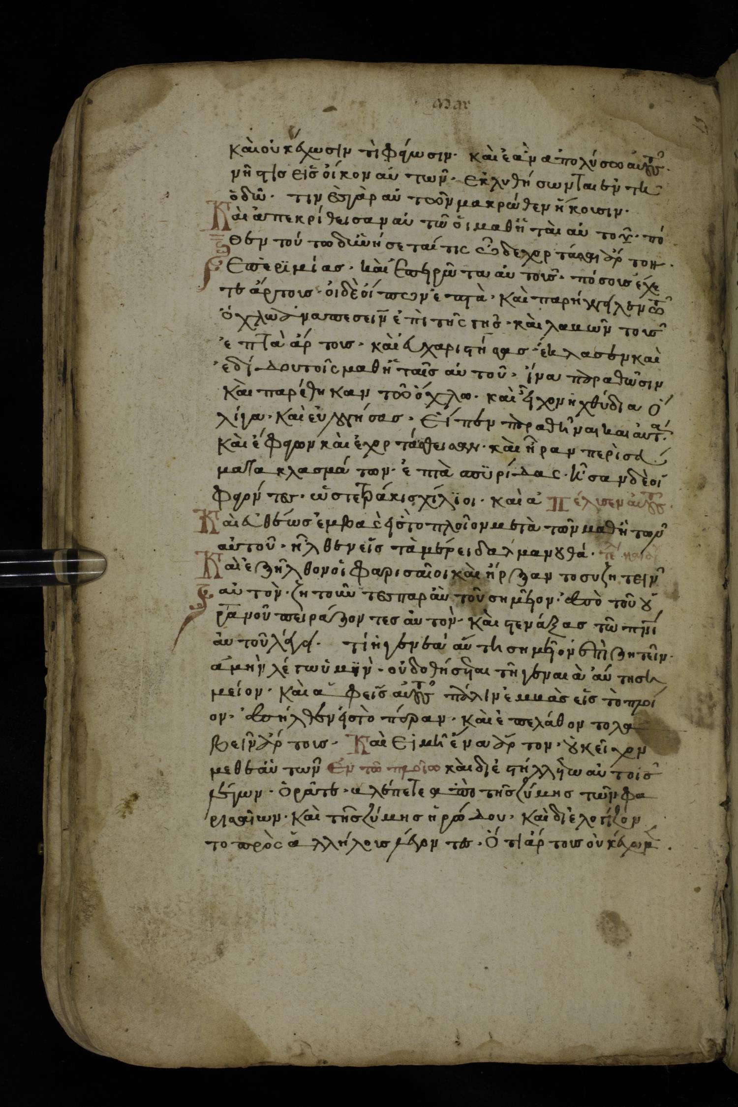 Fourteenth century minuscule of the Gospels on paper; 161 leaves, 1 column, 25-30 lines per column. Images were taken at the National Library of Greece in Athens.