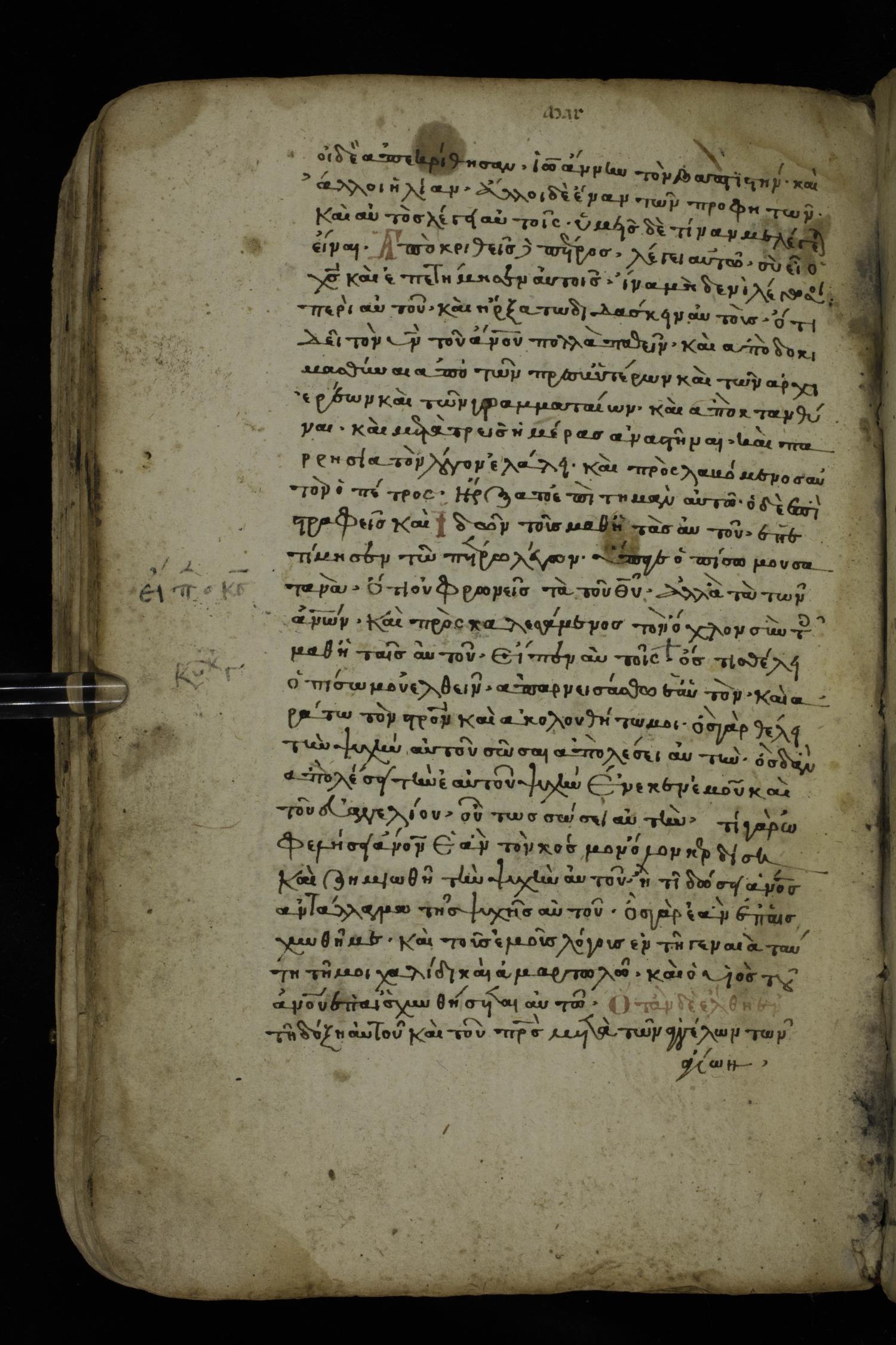 Fourteenth century minuscule of the Gospels on paper; 161 leaves, 1 column, 25-30 lines per column. Images were taken at the National Library of Greece in Athens.