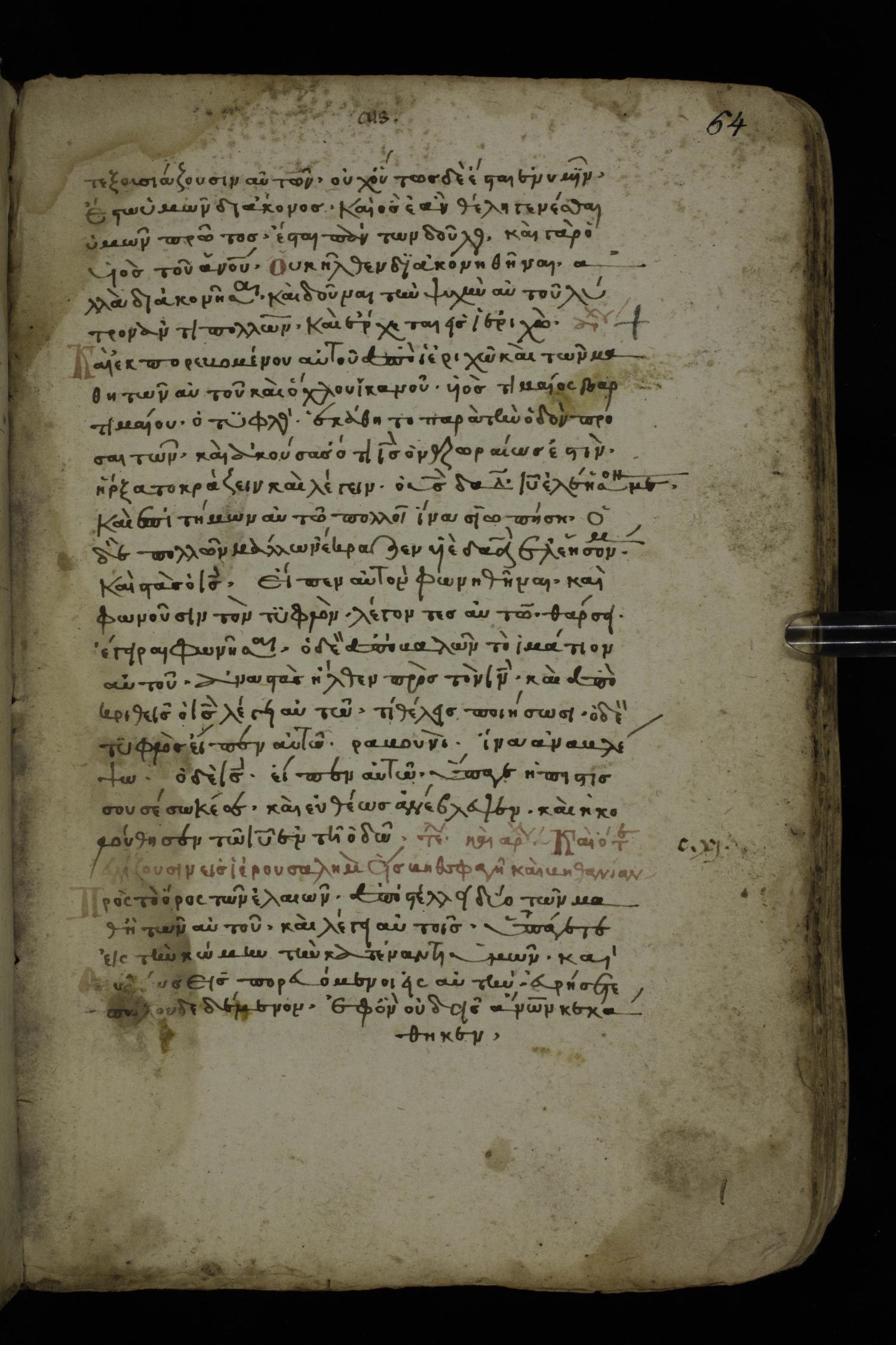 Fourteenth century minuscule of the Gospels on paper; 161 leaves, 1 column, 25-30 lines per column. Images were taken at the National Library of Greece in Athens.