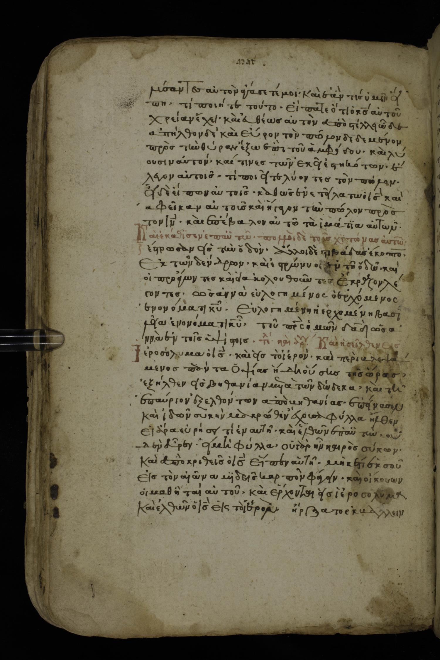 Fourteenth century minuscule of the Gospels on paper; 161 leaves, 1 column, 25-30 lines per column. Images were taken at the National Library of Greece in Athens.