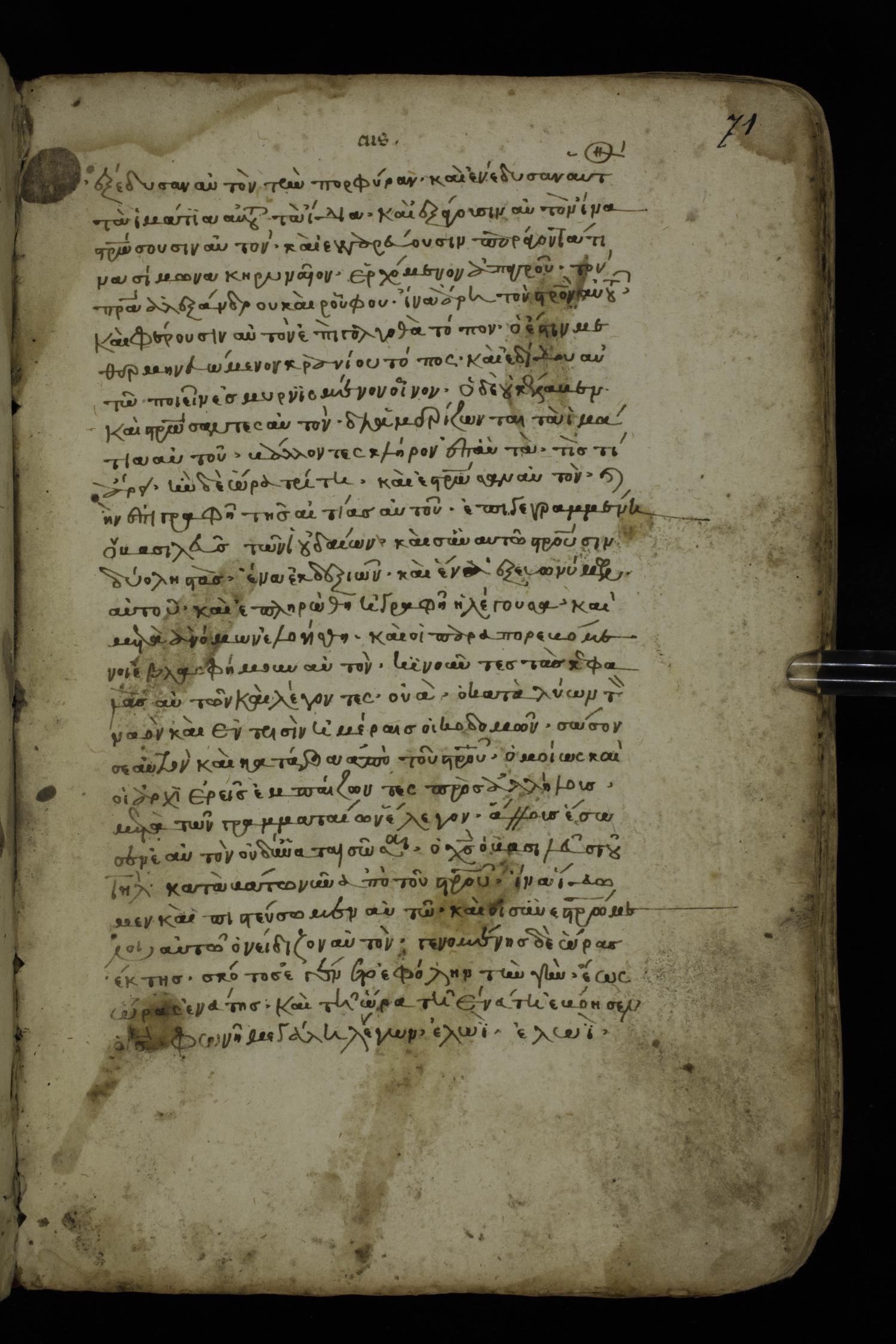 Fourteenth century minuscule of the Gospels on paper; 161 leaves, 1 column, 25-30 lines per column. Images were taken at the National Library of Greece in Athens.