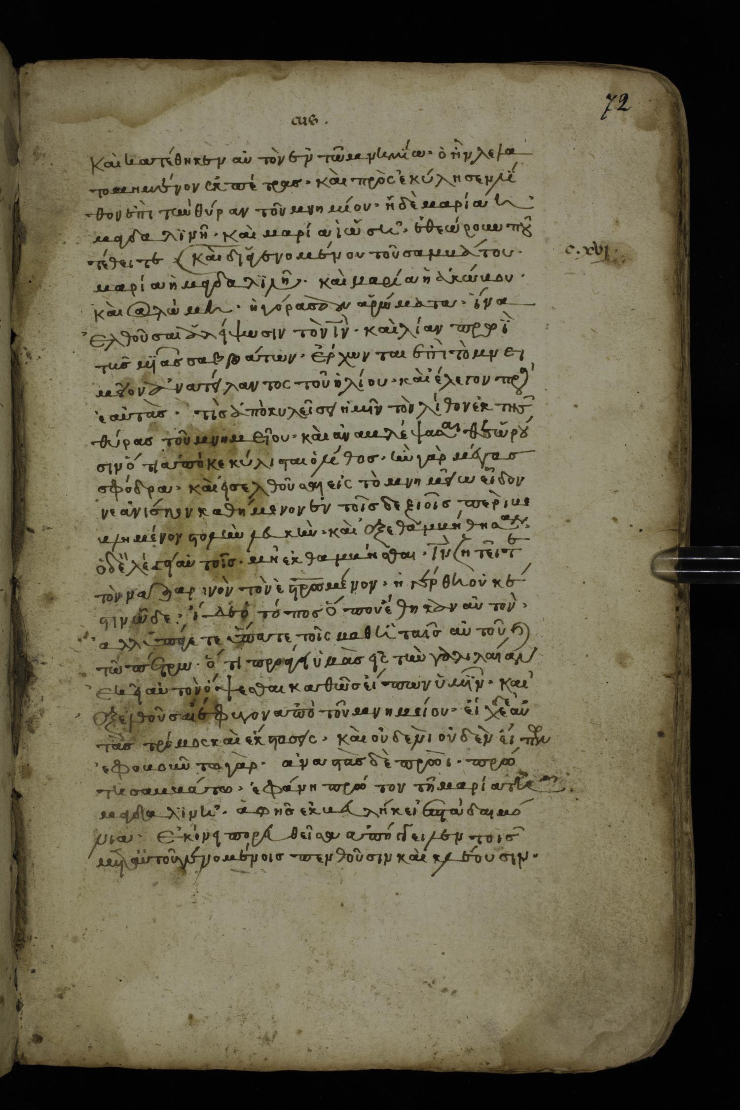 Fourteenth century minuscule of the Gospels on paper; 161 leaves, 1 column, 25-30 lines per column. Images were taken at the National Library of Greece in Athens.