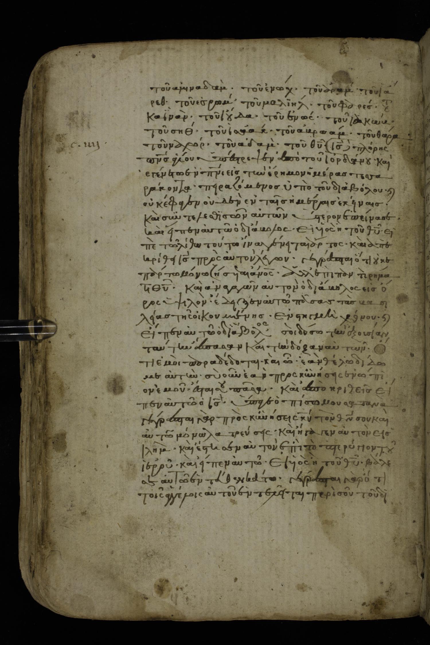 Fourteenth century minuscule of the Gospels on paper; 161 leaves, 1 column, 25-30 lines per column. Images were taken at the National Library of Greece in Athens.
