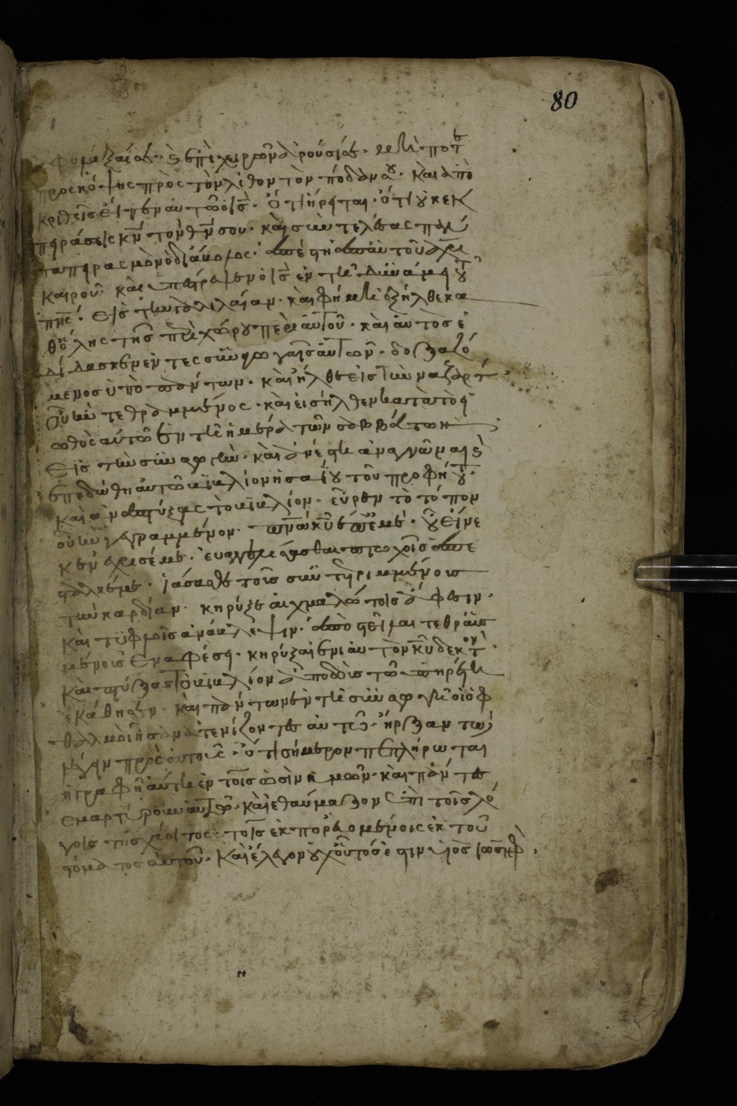 Fourteenth century minuscule of the Gospels on paper; 161 leaves, 1 column, 25-30 lines per column. Images were taken at the National Library of Greece in Athens.
