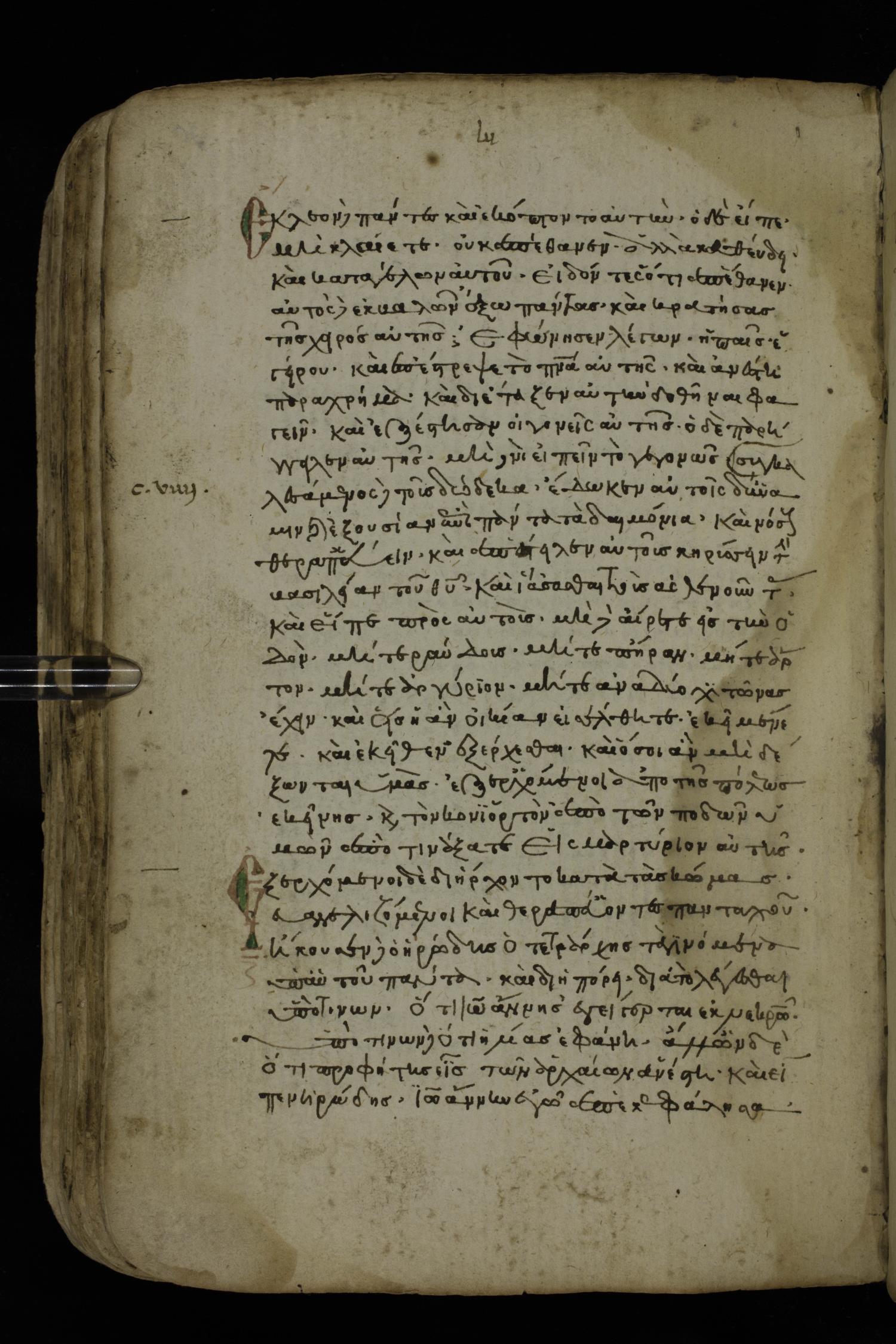 Fourteenth century minuscule of the Gospels on paper; 161 leaves, 1 column, 25-30 lines per column. Images were taken at the National Library of Greece in Athens.