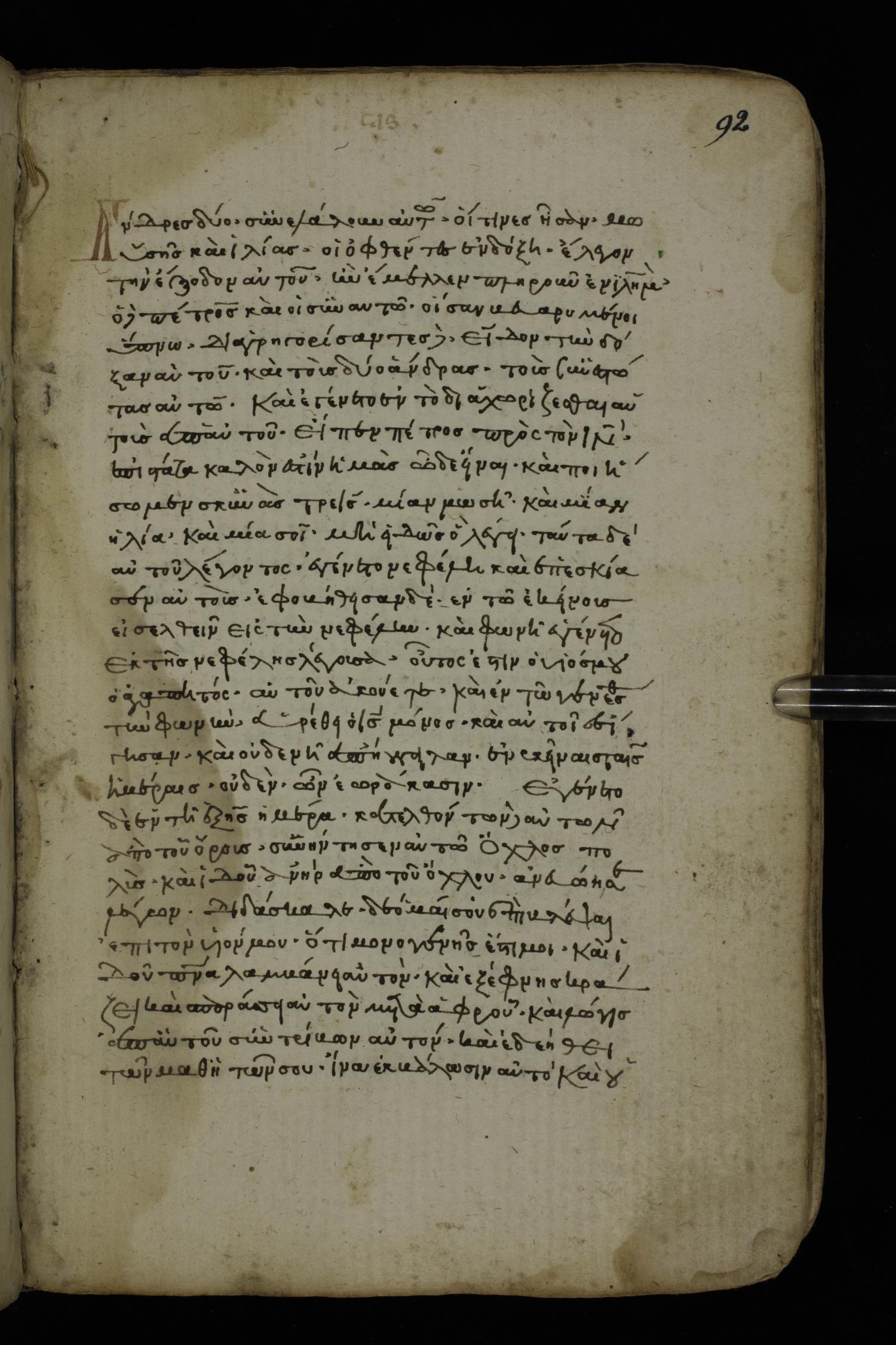 Fourteenth century minuscule of the Gospels on paper; 161 leaves, 1 column, 25-30 lines per column. Images were taken at the National Library of Greece in Athens.