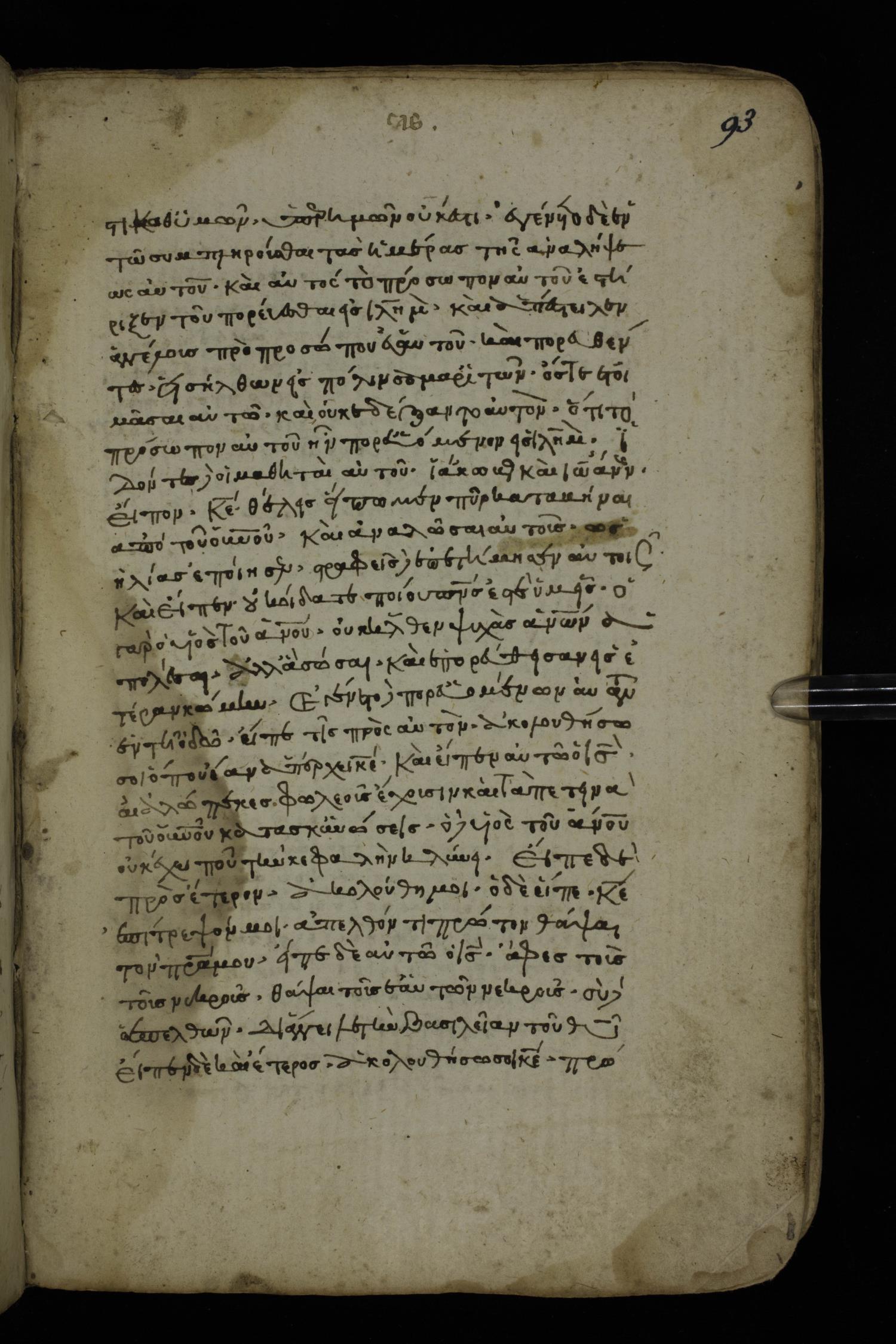 Fourteenth century minuscule of the Gospels on paper; 161 leaves, 1 column, 25-30 lines per column. Images were taken at the National Library of Greece in Athens.