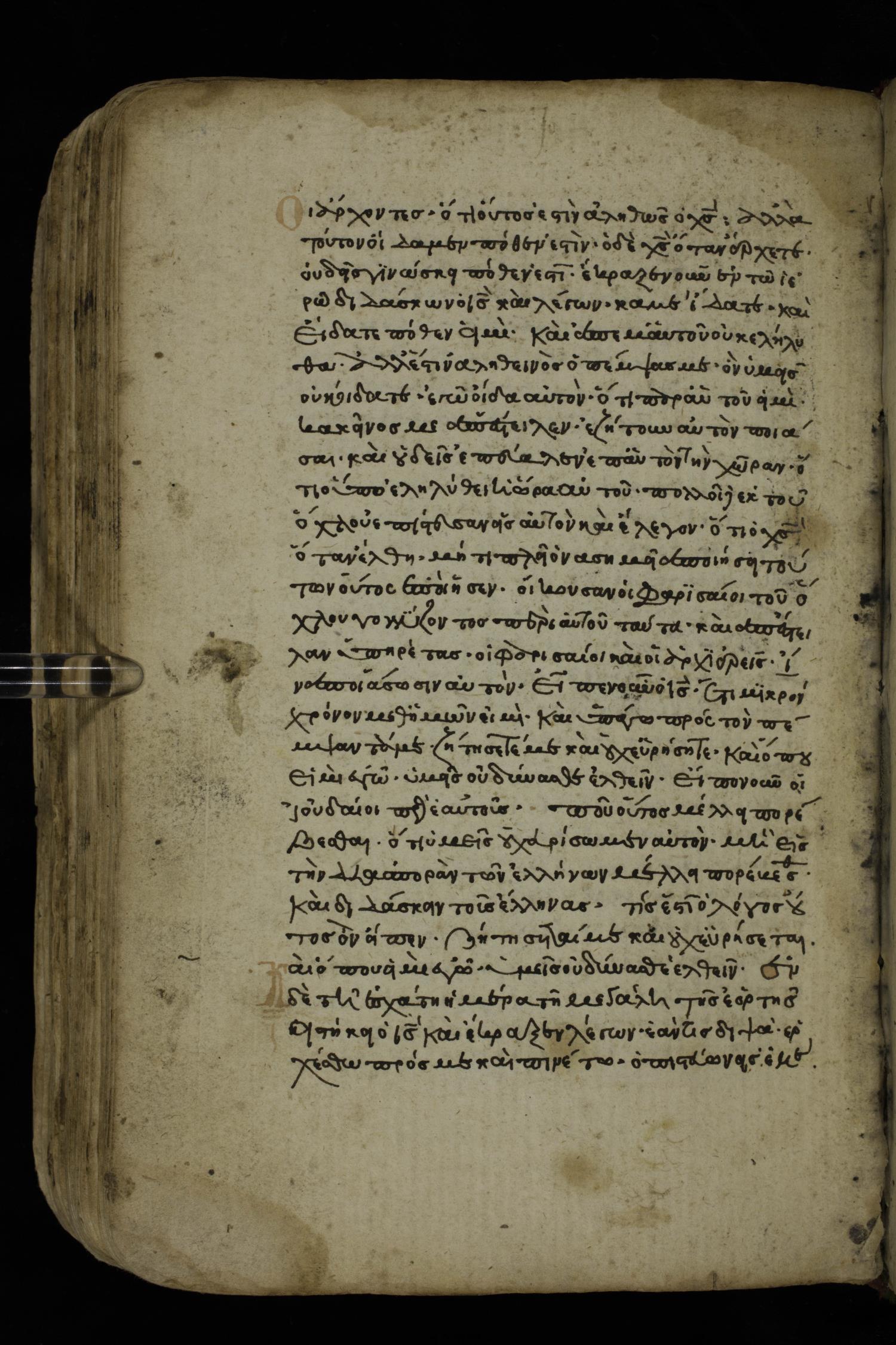 Fourteenth century minuscule of the Gospels on paper; 161 leaves, 1 column, 25-30 lines per column. Images were taken at the National Library of Greece in Athens.