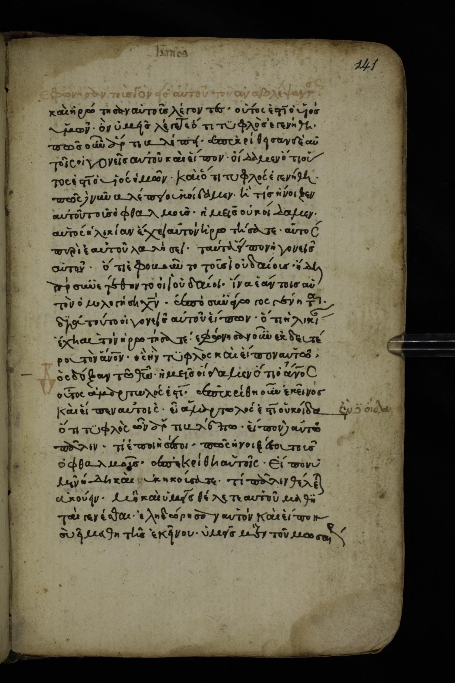 Fourteenth century minuscule of the Gospels on paper; 161 leaves, 1 column, 25-30 lines per column. Images were taken at the National Library of Greece in Athens.
