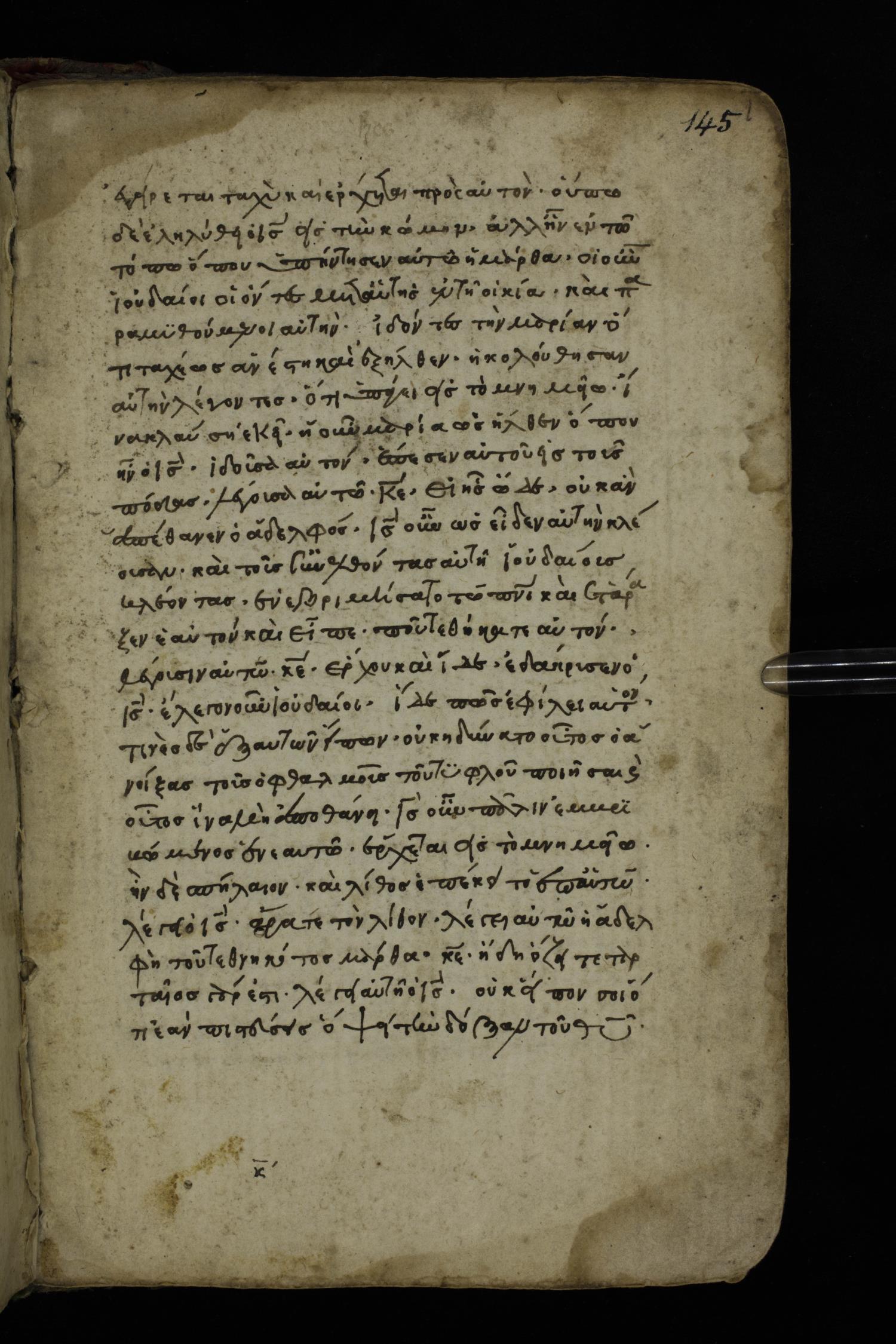 Fourteenth century minuscule of the Gospels on paper; 161 leaves, 1 column, 25-30 lines per column. Images were taken at the National Library of Greece in Athens.