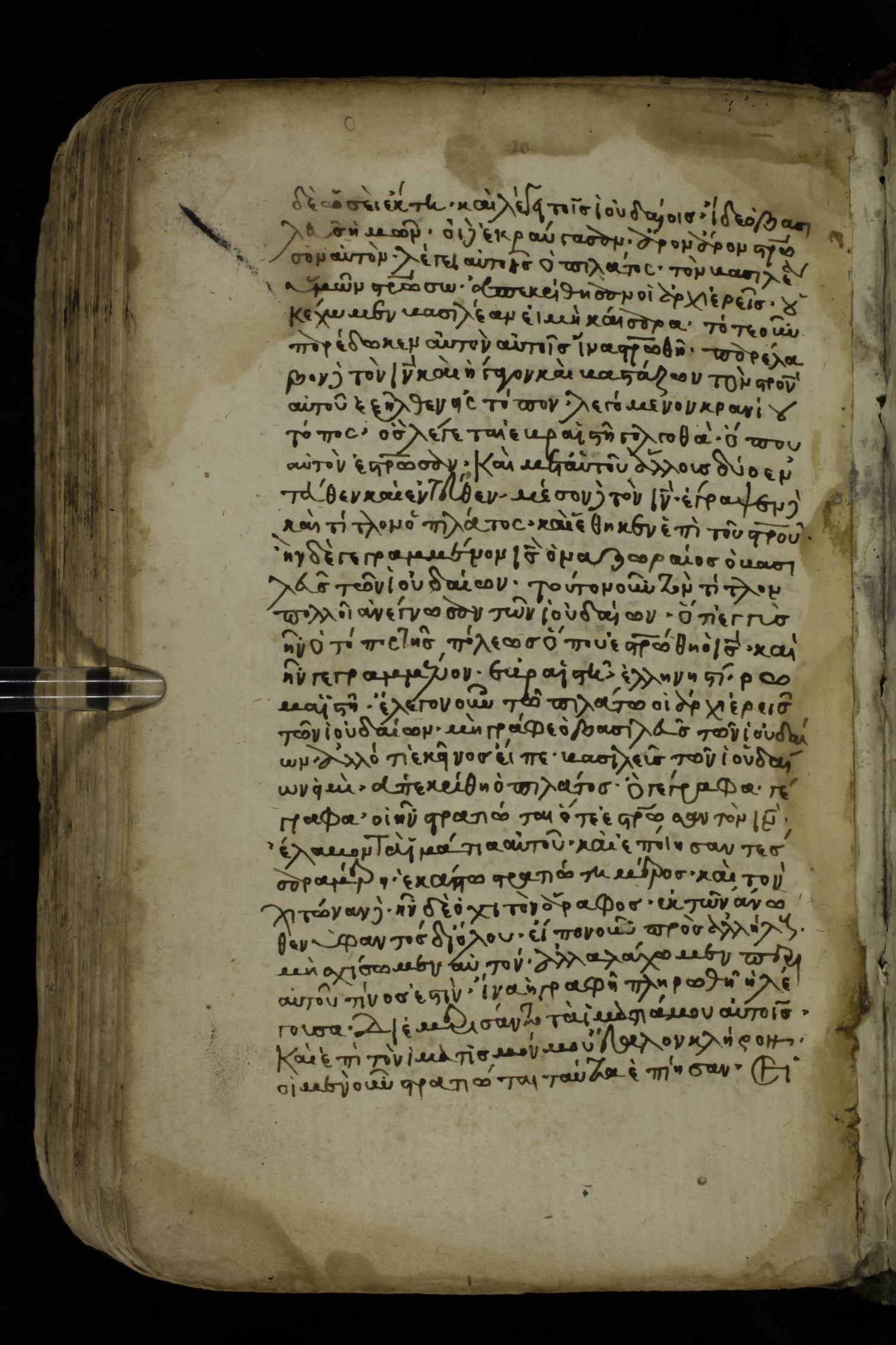 Fourteenth century minuscule of the Gospels on paper; 161 leaves, 1 column, 25-30 lines per column. Images were taken at the National Library of Greece in Athens.