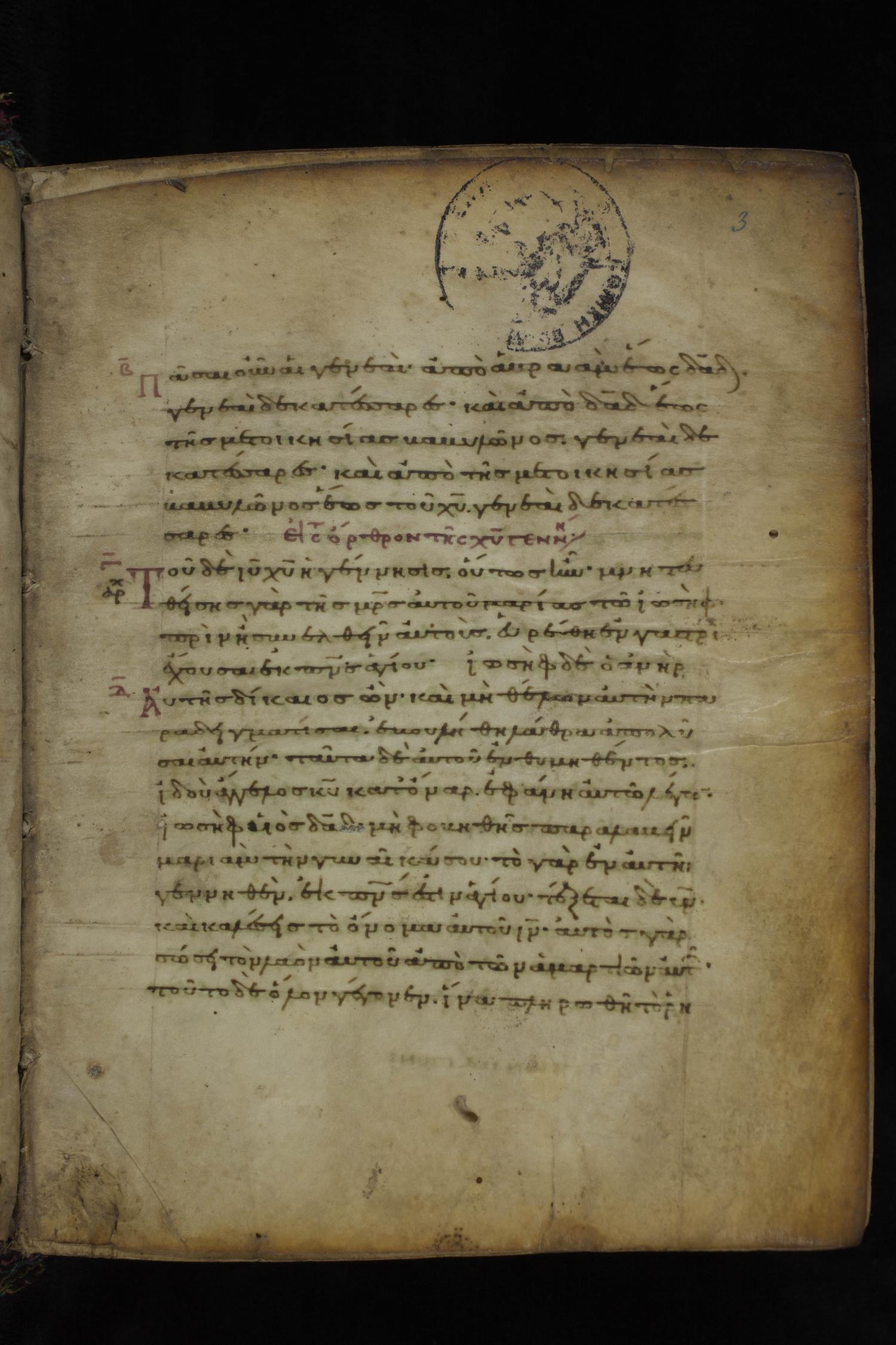 Eleventh or twelfth century minuscule of the Gospels on parchment; 231 leaves, 1 column, 21 lines per column. Images were taken at the National Library of Greece in Athens.