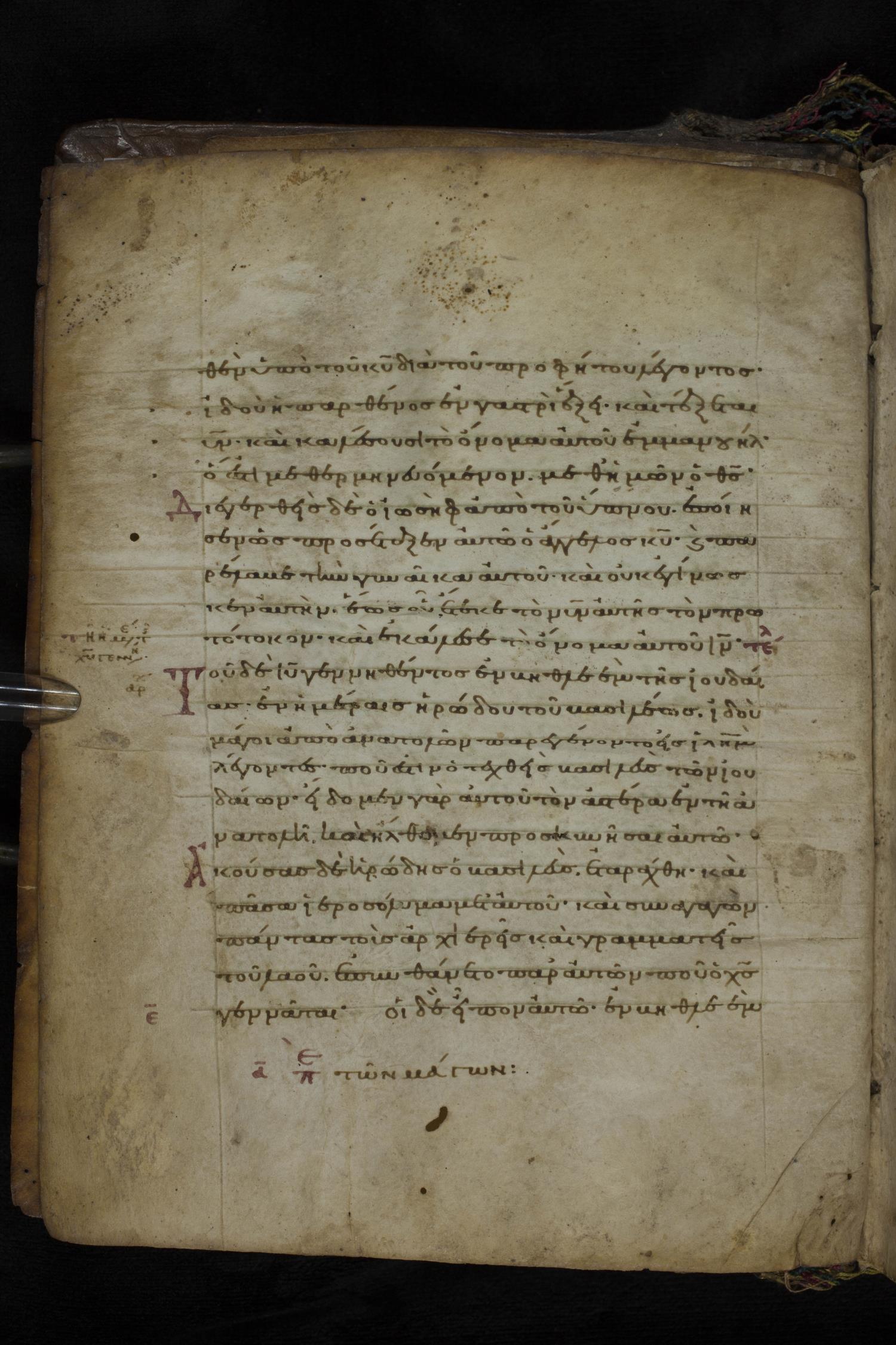 Eleventh or twelfth century minuscule of the Gospels on parchment; 231 leaves, 1 column, 21 lines per column. Images were taken at the National Library of Greece in Athens.