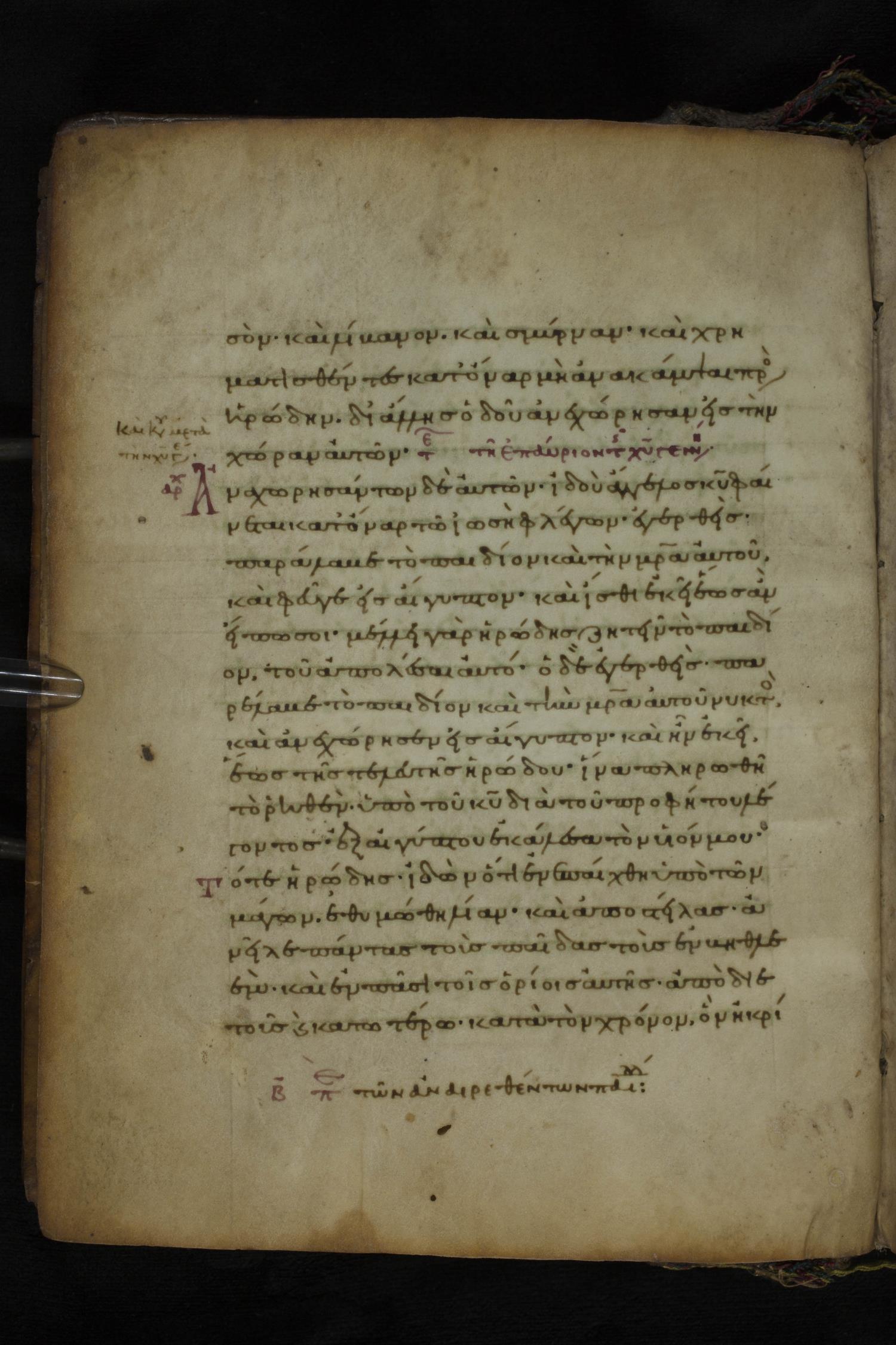 Eleventh or twelfth century minuscule of the Gospels on parchment; 231 leaves, 1 column, 21 lines per column. Images were taken at the National Library of Greece in Athens.