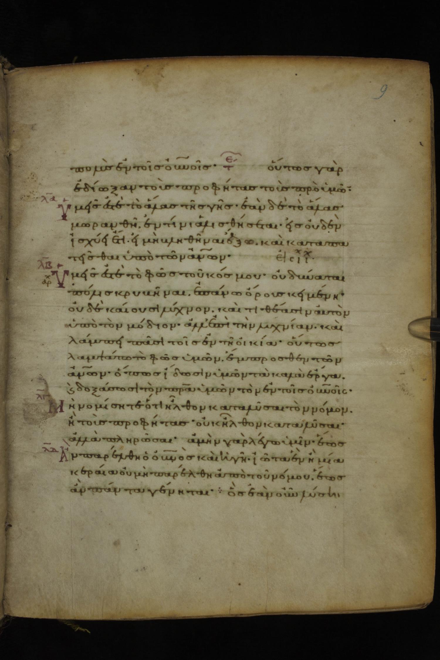 Eleventh or twelfth century minuscule of the Gospels on parchment; 231 leaves, 1 column, 21 lines per column. Images were taken at the National Library of Greece in Athens.