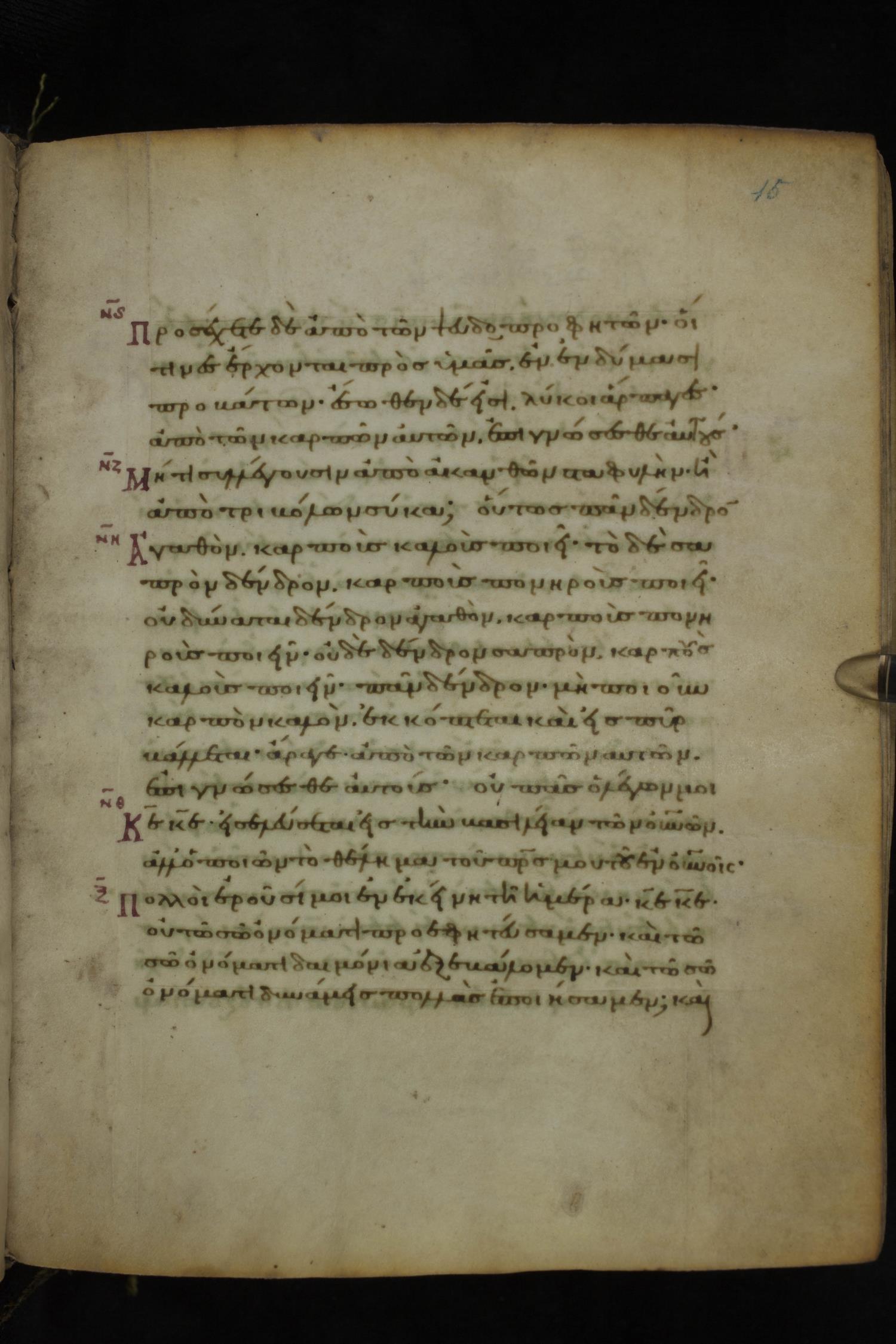 Eleventh or twelfth century minuscule of the Gospels on parchment; 231 leaves, 1 column, 21 lines per column. Images were taken at the National Library of Greece in Athens.